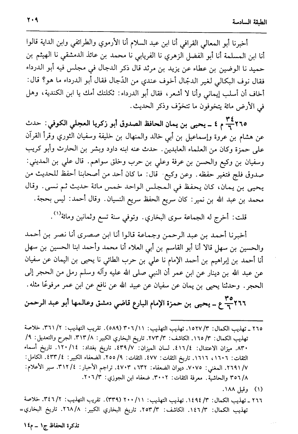 265- 34/ 6م4- يحيى بن يمان الحافظ الصدوق أبو زكريا العجلي الكوفى: حدث عن هشام بن عروة وإسماعيل بن أبي خالد والمنهال بن خليفة وسفيان الثوري وقرأ القرآن على حمزة وكان من العلماء العابدين. حدث عنه ابنه داود وبشر بن الحارث وأبو كريب وسفيان بن وكيع والحسن بن عرفة وعلي بن حرب وخلق سواهم. قال علي بن المديني: صدوق فلج فتغير حفظه. وعن وكيع قال: ما كان أحد من أصحابنا أحفظ للحديث من يحيى بن يمان، كان يحفظ في المجلس الواحد خمس مائة حديث ثم نسي. وقال محمد بن عبد الله بن نمير: كان سريع الحفظ سريع النسيان. وقال أحمد: ليس بحجة.