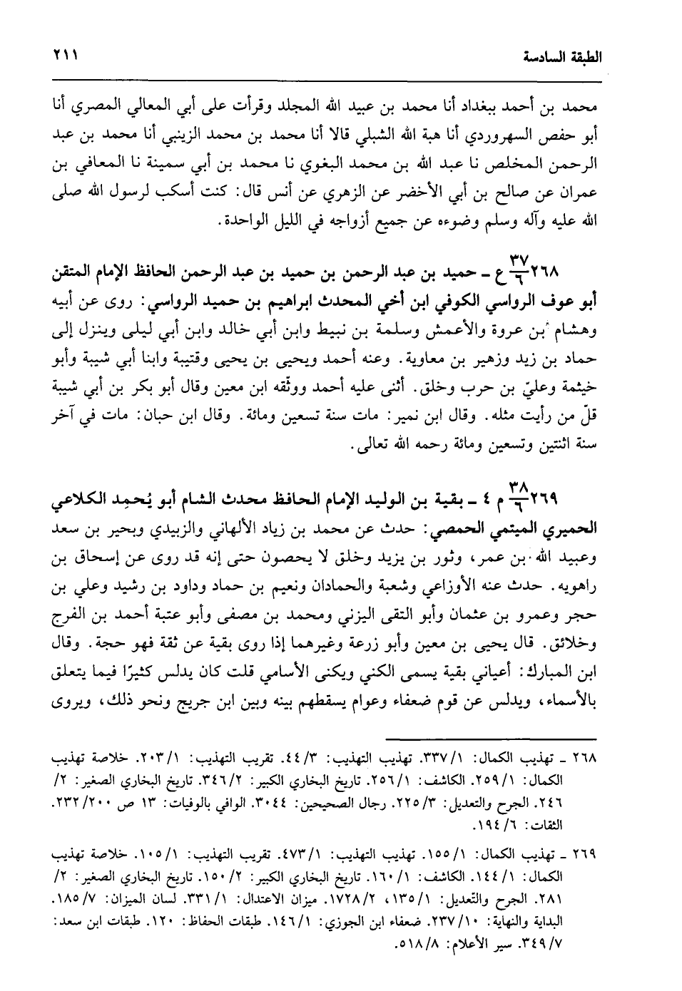 269- 38/ 6م 4 - بقية بن الوليد الإمام الحافظ محدث الشام أبو يُحْمِد الكلاعي الحميري الميتمي الحمصي: حدث عن محمد بن زياد الألهاني والزبيدي وبحير بن سعد وعبيد الله بن عمر، وثور بن يزيد وخلق لا يحصون حتى إنه قد روى عن إسحاق بن راهويه. حدث عنه الأوزاعي وشعبة والحمادان ونعيم بن حماد وداود بن رشيد وعلي بن حجر وعمرو بن عثمان وأبو التقى اليزني ومحمد بن مصفى وأبو عتبة أحمد بن الفرج وخلائق. قال يحيى بن معين وأبو زرعة وغيرهما إذا روى بقية عن ثقة فهو حجة. وقال ابن المبارك أعياني بقية يسمى الكني ويكنى الأسامي قلت كان يدلس كثيرا فيما يتعلق بالأسماء ويدلس عن قوم ضعفاء وعوام يسقطهم بينه وبين ابن جريج ونحو ذلك. ويروى