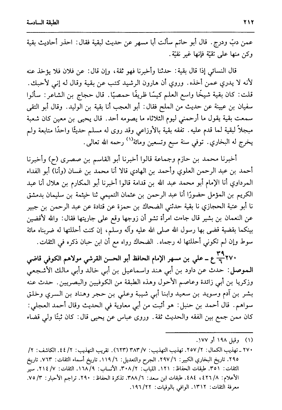270- تهذيب الكمال: 2/ 257. تهذيب التهذيب: 7/ 383 "623". تقريب التهذيب: 2/ 44. الكاشف: 2/ 295. تاريخ البخاري الكبير: 6/ 297. الجرح والتعديل: 6/ 119. تاريخ أسماء الثقات: 763. تاريخ الثقات: 351. طبقات الحفاظ: 121. اللباب: 2/ 308. الأنساب: 9/ 168. الثقات: 7/ 214. سير الأعلام: 8/ 426، 484. طبقات ابن سعد: 6/ 388. تذكرة الحفاظ: 290. تراجم الأحبار: 3/ 75. معرفة الثقات: 1321. الوافي بالوفيات: 22/ 196.