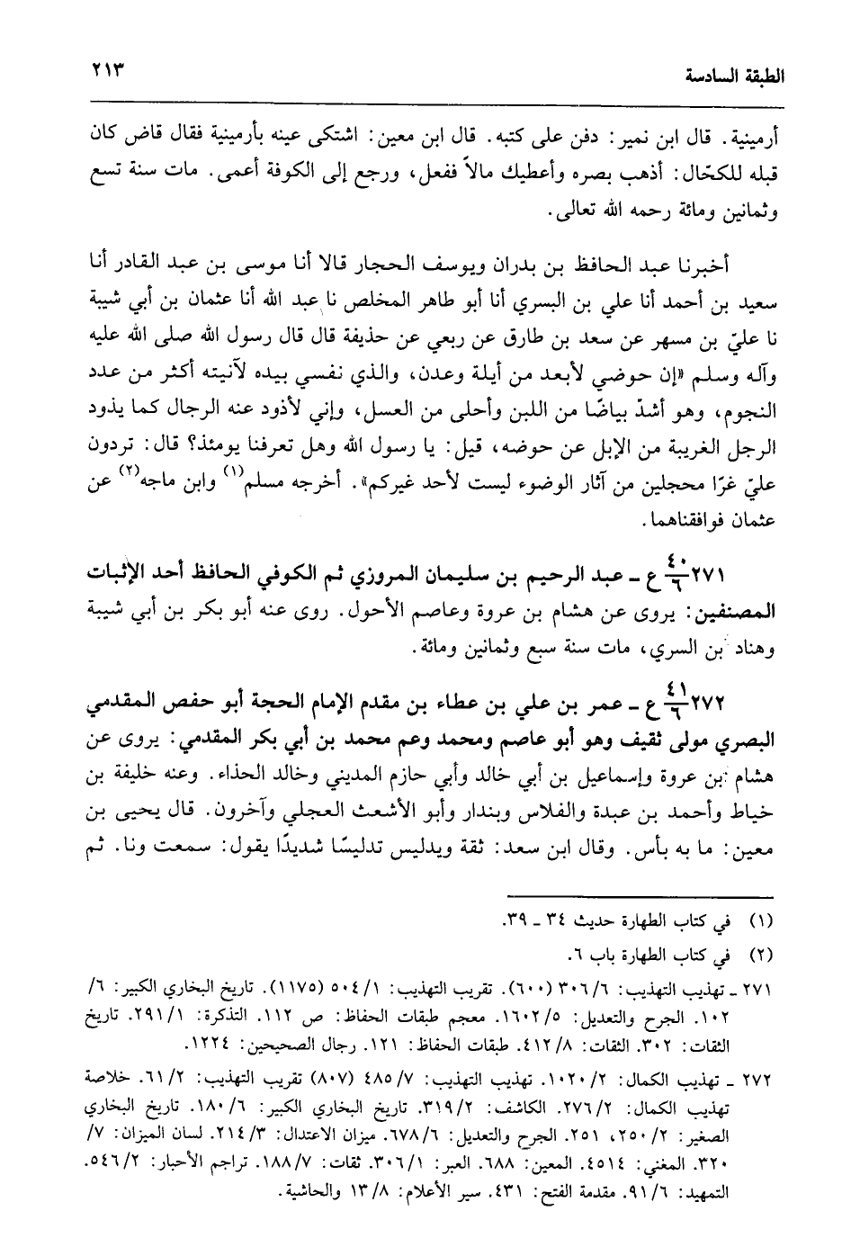 271- تهذيب التهذيب: 6/ 306 "600" تقريب التهذيب: 1/ 504 "1175". تاريخ البخاري الكبير: 6/ 102. الجرح والتعديل: 5/ 1602. معجم طبقات الحفاظ: ص112. التذكرة: 1/ 291. تاريخ الثقات: 302 الثقات: 8/ 412. طبقات الحفاظ: 121. رجال الصحيحين: 1224.