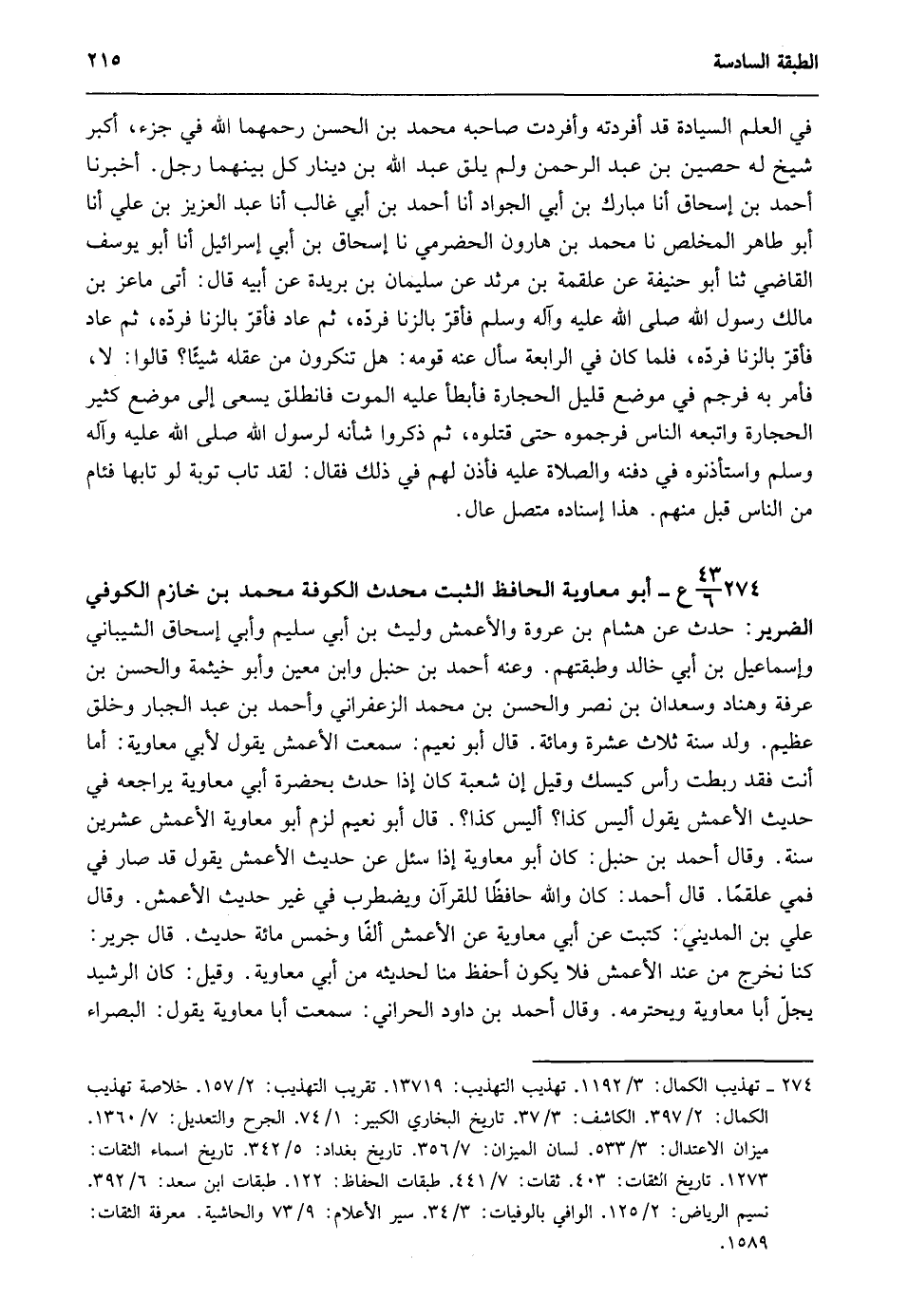 274- 43/ 6 ع- أبو معاوية الحافظ الثبت محدث الكوفة محمد بن خازم الكوفي الضرير: حدث عن هشام بن عروة والأعمش وليث بن أبي سليم وأبي إسحاق الشيباني وإسماعيل بن أبي خالد وطبقتهم. وعنه أحمد بن حنبل وابن معين وأبو خيثمة والحسن بن عرفة وهناد وسعدان بن نصر والحسن بن محمد الزعفراني وأحمد بن عبد الجبار وخلق عظيم. ولد سنة ثلاث عشرة ومائة. قال أبو نعيم: سمعت الأعمش يقول لأبي معاوية أما أنت فقد ربطت رأس كيسك وقيل إن شعبة كان إذا حدث بحضرة أبي معاوية يراجعه في حديث الأعمش يقول أليس كذا؟ أليس كذا؟. قال أبو نعيم لزم أبو معاوية الأعمش عشرين سنة. وقال أحمد بن حنبل: كان أبو معاوية إذا سئل عن حديث الأعمش يقول قد صار في فمي علقما. قال أحمد: كان والله حافظا للقرآن ويضطرب في غير حديث الأعمش. وقال علي بن المديني: كتبت عن أبي معاوية عن الأعمش ألفا وخمس مائة حديث. قال جرير: كنا نخرج من عند الأعمش فلا يكون أحفظ منا لحديثه من أبي معاوية. وقيل: كان الرشيد يجلّ أبا معاوية ويحترمه. وقال أحمد بن داود الحراني: سمعت أبا معاوية يقول: البصراء