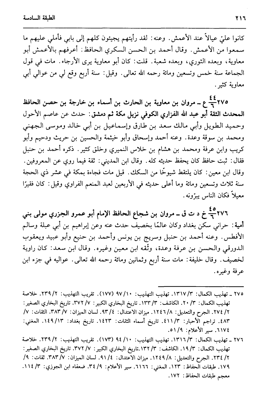 275- 44/ 6 ع- مروان بن معاوية بن الحارث بن أسماء بن خارجة بن حصن الحافظ المحدث الثقة أبو عبد الله الفزاري الكوفي نزيل مكة ثم دمشق: حدث عن عاصم الأحول وحميد الطويل وأبي مالك سعد بن طارق وإسماعيل بن أبي خالد وموسى الجهني ومحمد بن سوقة وعدة. وعنه أحمد وإسحاق وأبو خيثمة والحسين بن حريث ودحيم وأبو كريب وابن عرفة ومحمد بن هشام بن خلاس النميري وخلق كثير. ذكره أحمد بن حنبل فقال: ثبت حافظ كان يحفظ حديثه كله. وقال ابن المديني: ثقة فيما روى عن المعروفين. وقال ابن معين: كان يلتقط شيوخا من السكك. قيل مات فجاءة بمكة في عشر ذي الحجة سنة ثلاث وتسعين ومائة وما أعلى حديثه في الأربعين لعبد المنعم الفراوي وقيل: كان فقيرا معيلا فكان الناس يبرّونه.