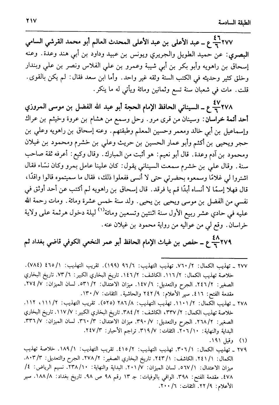 277- 46/ 6 ع- عبد الأعلى بن عبد الأعلى المحدث العالم أبو محمد القرشي السامي البصري: عن حميد الطويل والجريري ويونس بن عبيد وداود بن أبي هند وعدة. وعنه إسحاق بن راهويه وأبو بكر بن أبي شيبة وعمرو بن علي الفلاس ونصر بن علي وبندار وخلق كثير وحديثه في الكتب الستة وثقه غير واحد. وأما ابن سعد فقال: لم يكن بالقوي قلت. مات في شعبان سنة تسع وثمانين ومائة ويأتي له ما ينكر.