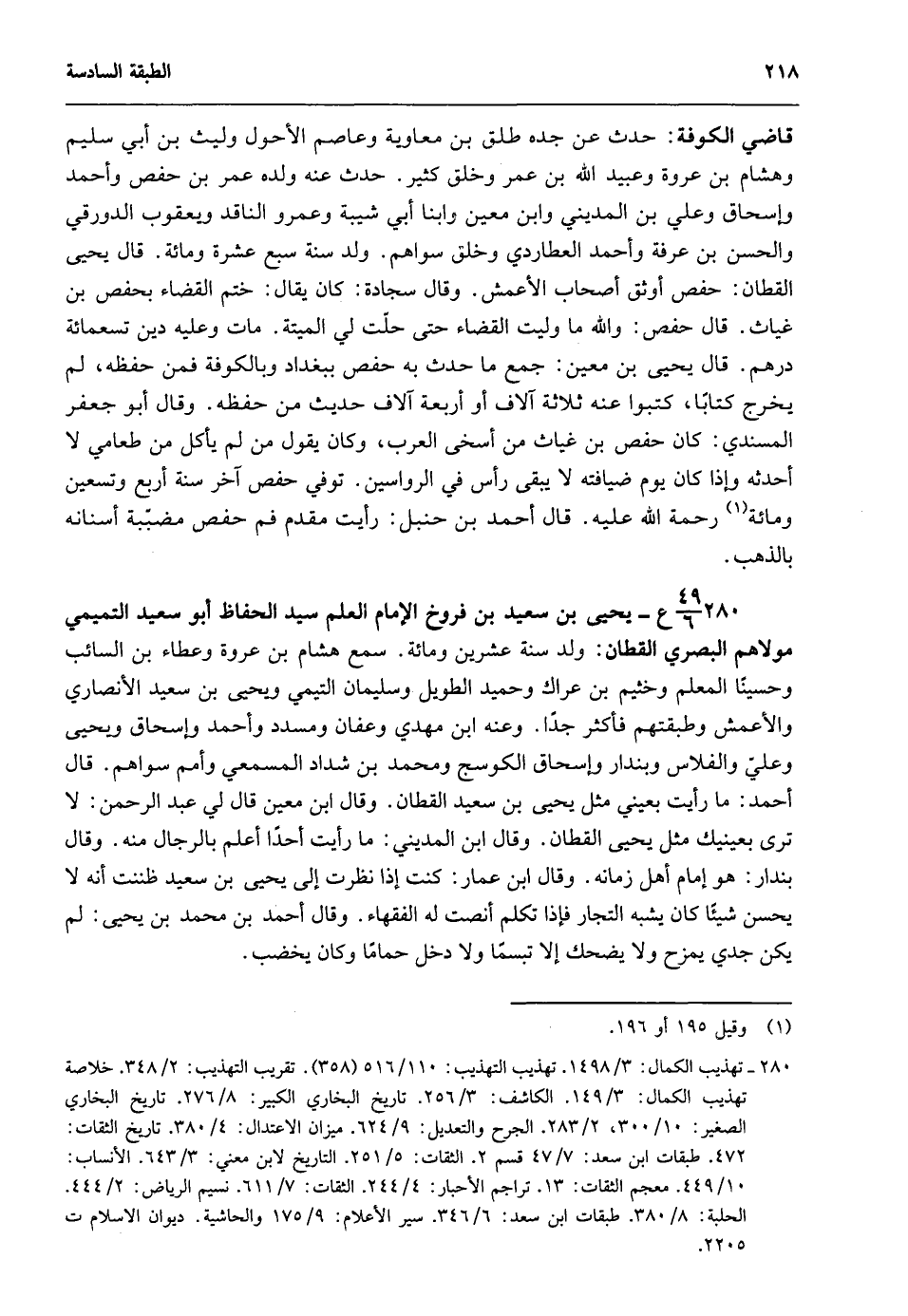 280- 49/ 6 ع- يحيى بن سعيد بن فروخ الإمام العلم سيد الحفاظ أبو سعيد التميمي مولاهم البصري القطان: ولد سنة عشرين ومائة. سمع هشام بن عروة وعطاء بن السائب وحسينا المعلم وخيثم بن عراك وحميد الطويل وسليمان التيمى ويحيى بن سعيد الأنصاري والأعمش وطبقتهم فأكثر جدا. وعنه ابن مهدي وعفان ومسدد وأحمد وإسحاق ويحيى وعلي والفلاس وبندار وإسحاق الكوسج ومحمد بن شداد المسمعي وأمم سواهم. قال أحمد: ما رأيت بعيني مثل يحيى بن سعيد القطان. وقال ابن معين قال لي عبد الرحمن: لا ترى بعينيك مثل يحيى القطان. وقال ابن المديني: ما رأيت أحدا أعلم بالرجال منه. وقال بندار: هو إمام أهل زمانه. وقال ابن عمار: كنت إذا نظرت إلى يحيى بن سعيد ظننت أنه لا يحسن شيئا كان يشبه التجار فإذا تكلم أنصت له الفقهاء. وقال أحمد بن محمد بن يحيى: لم يكن جدي يمزح ولا يضحك إلا تبسمًا ولا دخل حمامًا وكان يخضب.