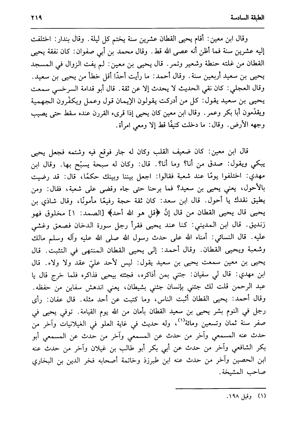 قال ابن معين: كان ضعيف القلب وكان له جار فوقع فيه وشتمه فجعل يحيى يبكى ويقول: صدق من أنا؟ وما أنا؟. قال: وكان له سبحة يسبح بها. وقال ابن مهدي: اختلفوا يوما عند شعبة فقالوا: اجعل بيننا وبينك حكما، قال: قد رضيت بالأحول، يعنى يحيى بن سعيد؟ فما برحنا حتى جاء وقضى على شعبة، فقال: ومن يطيق نقدك يا أحول. قال ابن سعد: كان ثقة حجة رفيعا مأمونا, وقال شاذي بن يحيى قال يحيى القطان من قال إن: {قُلْ هُوَ اللَّهُ أَحَد} [الإخلاص: 1] مخلوق فهو زنديق. قال ابن المديني: كنا عند يحيى فقرأ رجل سورة الدخان فصعق وغشي عليه. قال النسائي أمناء الله على حديث رسول الله صلى الله عليه وآله وسلم مالك وشعبة ويحيى القطان. وقال أحمد إلى يحيى القطان المنتهي في التثبت. قال يحيى بن معين سمعت يحيى بن سعيد يقول: ليس لأحد علي عقد ولا ولاء. قال ابن مهدي: قال لي سفيان: جئني بمن أذاكره، فجئته بيحيى فذاكره فلما خرج قال يا عبد الرحمن قلت لك جئني بإنسان جئتني بشيطان، يعني اندهش سفيان من حفظه. وقال أحمد: يحيى القطان أثبت الناس، وما كتبت عن أحد مثله. قال عفان: رأى رجل في النوم بشر يحيى بن سعيد القطان بأمان من الله يوم القيامة. توفي يحيى في صفر سنة ثمان وتسعين ومائة1, وله حديث في غاية العلو في الغيلانيات وآخر من حدث عنه المسمعي وآخر من حدث عن المسمعي أبو بكر الشافعي وآخر من حدث عن أبي بكر أبو طالب بن غيلان وآخر من حدث عنه ابن الحصين وآخر من حدث عنه ابن طبرزذ وخاتمة أصحابه فخر الدين بن البخاري صاحب المشيخة.