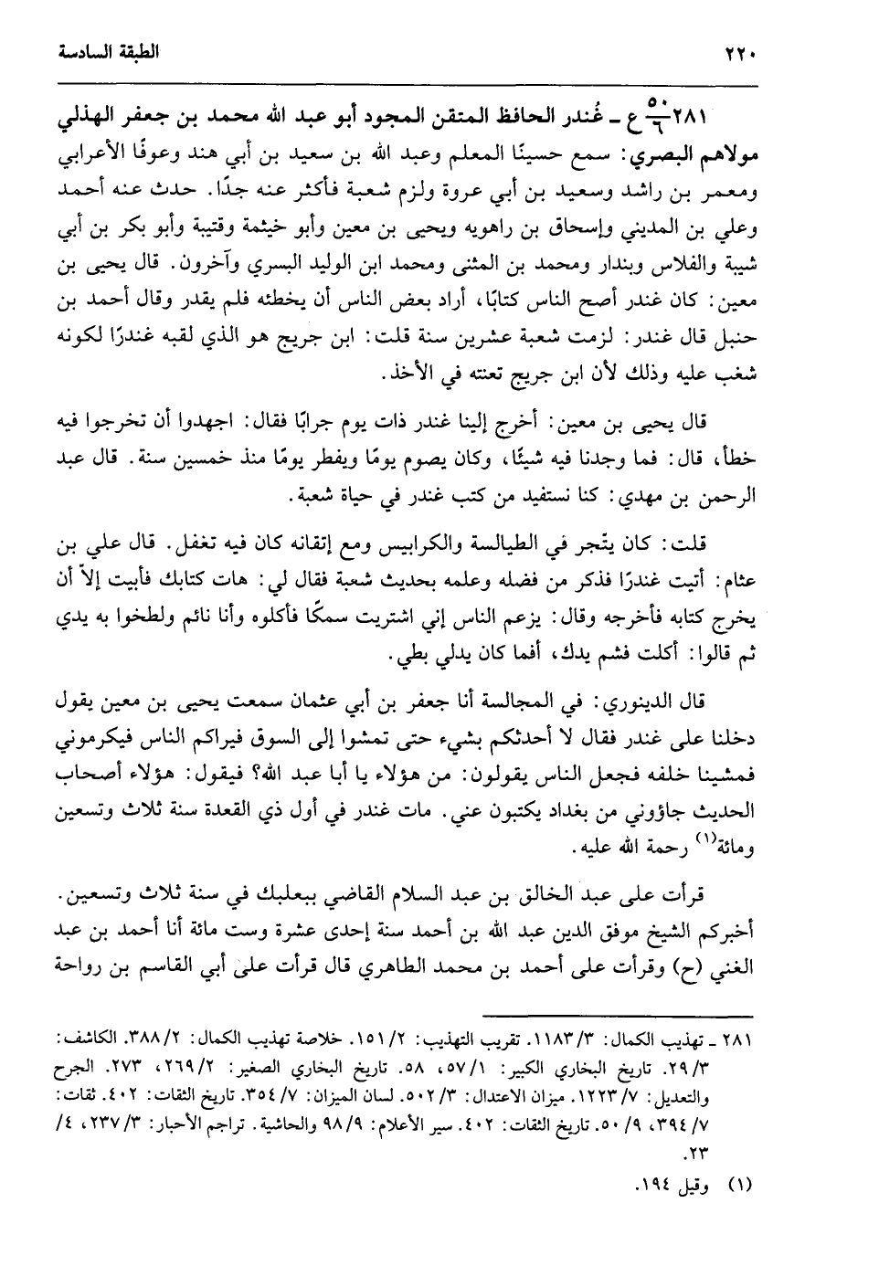 281- 50/ 6 ع- غُندر الحافظ المتقن المجود أبو عبد الله محمد بن جعفر الهذلي مولاهم البصري: سمع حسينا المعلم وعبد الله بن سعيد بن أبي هند وعوفا الأعرابي ومعمر بن راشد وسعيد بن أبي عروة ولزم شعبة فأكثر عنه جدا. حدث عنه أحمد وعلي بن المديني وإسحاق بن راهويه ويحيى بن معين وأبو خيثمة وقتيبة وأبو بكر بن أبي شيبة والفلاس وبندار ومحمد بن المثنى ومحمد بن الوليد البسري وآخرون. قال يحيى بن معين: كان غندر أصح الناس كتابا, أراد بعض الناس أن يخطئه فلم يقدر وقال أحمد بن حنبل قال غندر: لزمت شعبة عشرين سنة قلت: ابن جريج هو الذي لقبه غندرا لكونه شغب عليه وذلك لأن ابن جريج تعنته في الأخذ.