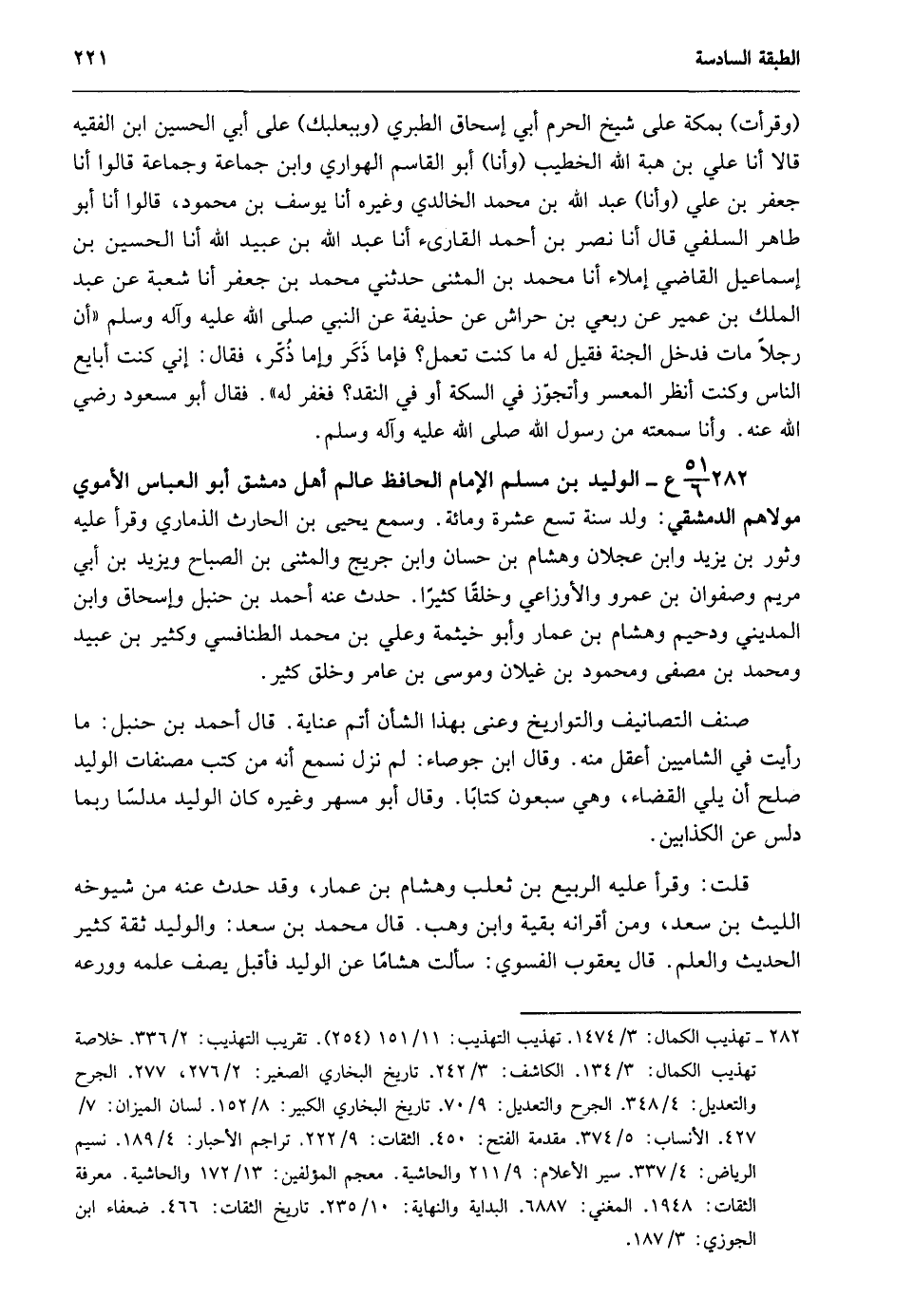 282- 51/ 6 ع- الوليد بن مسلم الإمام الحافظ عالم أهل دمشق أبو العباس الأموي مولاهم الدمشقي: ولد سنة تسع عشرة ومائة. وسمع يحيى بن الحارث الذماري وقرأ عليه وثور بن يزيد وابن عجلان وهشام بن حسان وابن جريج والمثني بن الصباح ويزيد بن أبي مريم وصفوان بن عمرو والأوزاعي وخلقًا كثيرًا. حدث عنه أحمد بن حنبل وإسحاق وابن المديني ودحيم وهشام بن عمار وأبو خيثمة وعلي بن محمد الطنافسي وكثير بن عبيد ومحمد بن مصفى ومحمود بن غيلان وموسى بن عامر وخلق كثير.