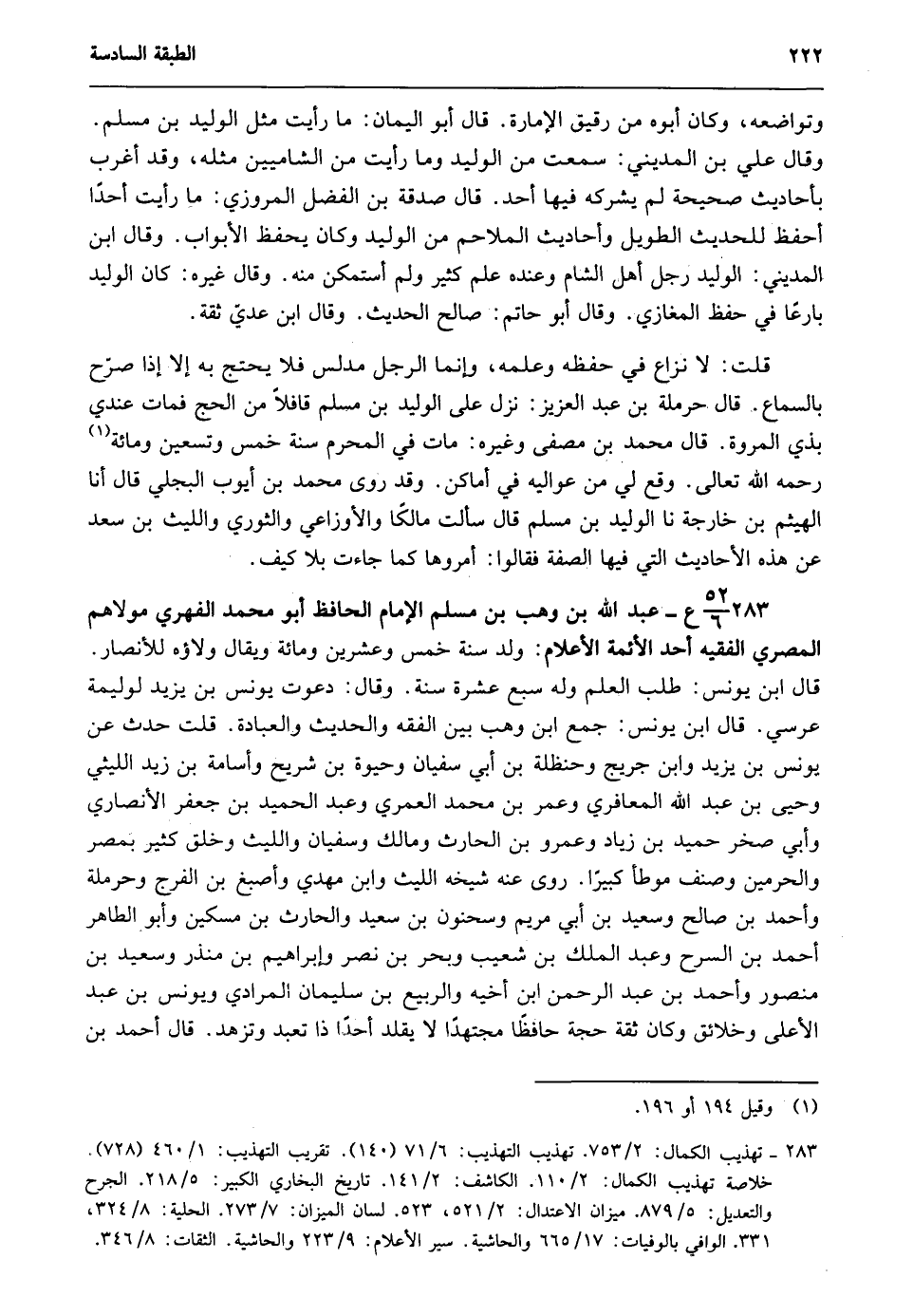 283- 52/ 6 ع- عبد الله بن وهب بن مسلم الإمام الحافظ أبو محمد الفهري مولاهم المصري الفقيه أحد الأئمة الأعلام: ولد سنة خمس وعشرين ومائة ويقال ولاؤه للأنصار. قال ابن يونس: طلب العلم وله سبع عشرة سنة. وقال: دعوت يونس بن يزيد لوليمة عرسي. قال ابن يونس: جمع ابن وهب بين الفقه والحديث والعبادة. قلت حدث عن يونس بن يزيد وابن جريج وحنظلة بن أبي سفيان وحيوة بن شريح وأسامة بن زيد الليثي وحيى بن عبد الله المعافري وعمر بن محمد العمري وعبد الحميد بن جعفر الأنصاري وأبي صخر حميد بن زياد وعمرو بن الحارث ومالك وسفيان والليث وخلق كثير بمصر والحرمين وصنف موطأ كبيرا. روى عنه شيخه الليث وابن مهدي وأصبغ بن الفرج وحرملة وأحمد بن صالح وسعيد بن أبي مريم وسحنون بن سعيد والحارث بن مسكين وأبو الطاهر أحمد بن السرح وعبد الملك بن شعيب وبحر بن نصر وإبراهيم بن منذر وسعيد بن منصور وأحمد بن عبد الرحمن بن أخيه والربيع بن سليمان المرادي ويونس بن عبد الأعلى وخلائق وكان ثقة حجة حافظا مجتهدا لا يقلد أحدا ذا تعبد وتزهد. قال أحمد بن