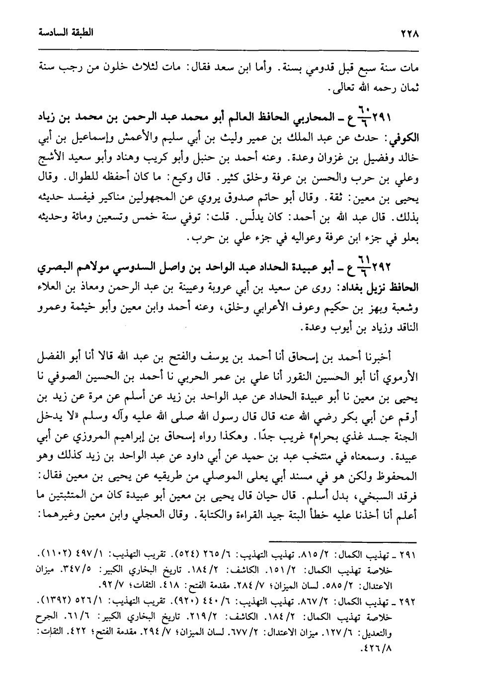 292- 61/ 6 ع- أبو عبيدة الحداد عبد الواحد بن واصل السدوسي مولاهم البصري الحافظ نزيل بغداد: روى عن سعيد بن أبي عروبة وعيينة بن عبد الرحمن ومعاذ بن العلاء وشعبة وبهز بن حكيم وعوف الأعرابي وخلق، وعنه أحمد وابن معين وأبو خيثمة وعمرو الناقد وزياد بن أيوب وعدة.