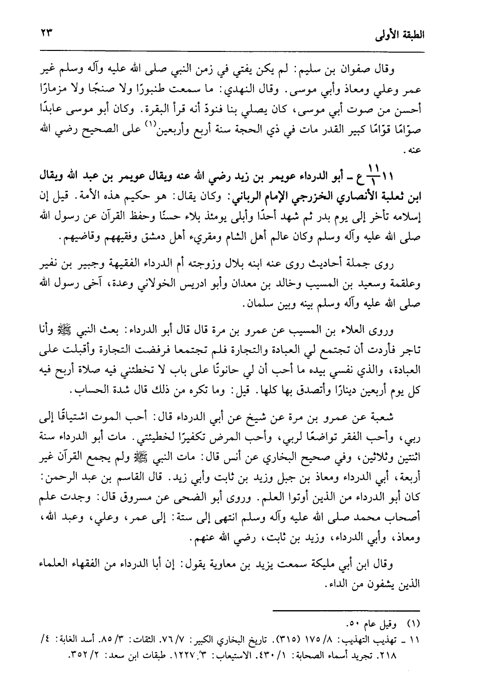 11- 11/ 1 ع- أبو الدرداء عويمر بن زيد رضي الله عنه ويقال عويمر بن عبد الله ويقال بن ثعلبة الأنصاري الخزرجي الإمام الرباني: وكان يقال: هو حكيم هذه الأمة. قيل إن إسلامه تأخر إلى يوم بدر ثم شهد أحدا وأبلى يومئذ بلاء حسنا وحفظ القرآن عن رسول الله صلى الله عليه وآله وسلم وكان عالم أهل الشام ومقرئ أهل دمشق وفقيههم وقاضيهم.