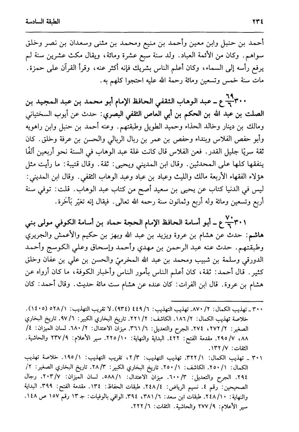 301- 70/ 6ع- أبو أسامة الحافظ الإمام الحجة حماد بن أسامة الكوفي مولى بني هاشم: حدث عن هشام بن عروة ويزيد بن عبد الله وبهز بن حكيم والأعمش والجريري وطبقتهم. حدث عنه عبد الرحمن بن مهدى وأحمد وإسحاق وعلي الكوسج وأحمد الدورقي وسلمة بن شبيب ومحمد بن عبد الله المخرمي والحسن بن علي بن عفان وخلق كثير. قال أحمد: ثقة. كان أعلم الناس بأمور الناس وأخبار الكوفة، ما كان أرواه عن هشام بن عروة. قال ابن الفرات: كان عنده عن هشام ست مائة حديث. وقال أحمد: كان