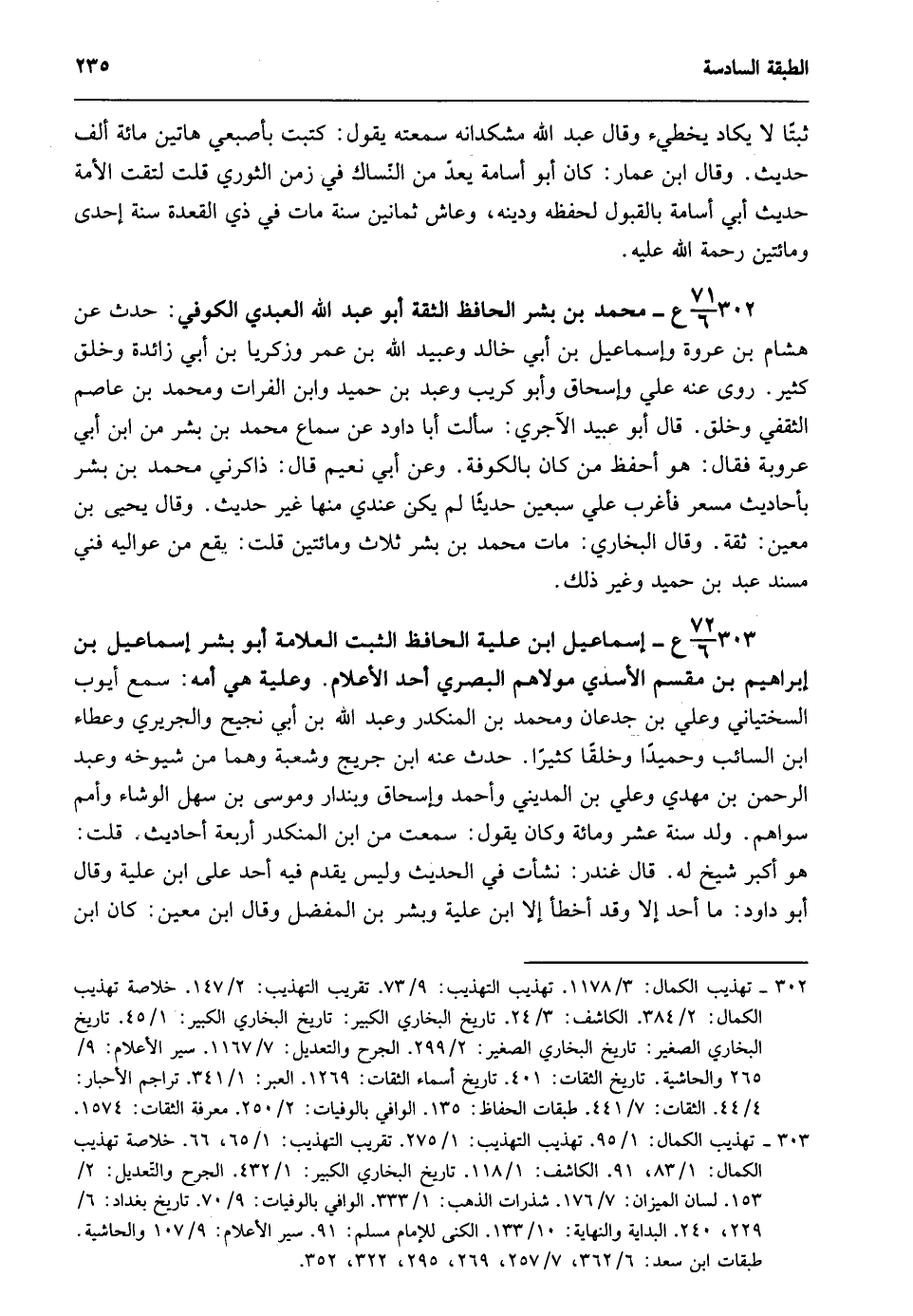 303- 72/ 6ع- إسماعيل بن علية الحافظ الثبت العلامة أبو بشر إسماعيل بن إبراهيم بن مقسم الأسدي مولاهم البصري أحد الأعلام. وعلية هي أمه: سمع أيوب السختياني وعلي بن جدعان ومحمد بن المنكدر وعبد الله بن أبي نجيح والجريري وعطاء بن السائب وحميدا وخلقا كثيرا. حدث عنه ابن جريج وشعبة وهما من شيوخه عبد الرحمن بن مهدى وعلي بن المديني وأحمد وإسحاق وبندار وموسى بن سهل الوشاء وأمم سواهم. ولد سنة عشر ومائة وكان يقول: سمعت من ابن المنكدر أربعة أحاديث، قلت: هو أكبر شيخ له. قال غندر: نشأت في الحديث وليس يقدم فيه أحد على ابن علية وقال أبو داود ما أحد إلا وقد أخطأ إلا ابن عليه وبشر بن المفضل وقال ابن معين كان ابن