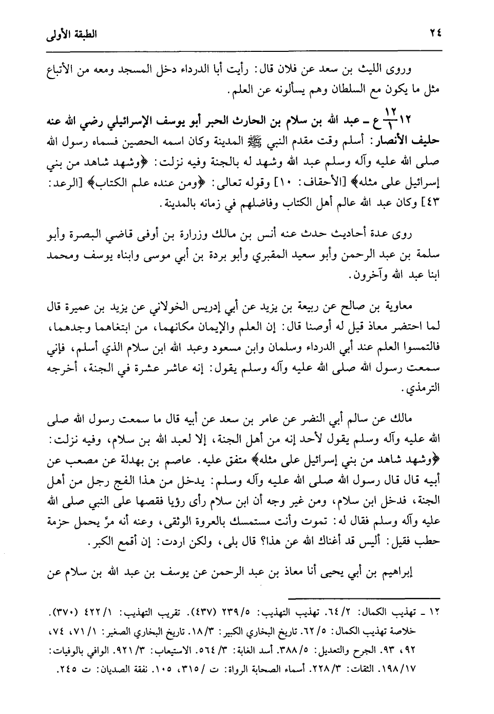 12- 12/ 1 ع- عبد الله بن سلام بن الحارث الحبر أبو يوسف الإسرائيلي رضي الله عنه حليف الأنصار: أسلم وقت مقدم النبي صلى الله عليه وسلم المدينة وكان اسمه الحصين فسماه رسول الله صلى الله عليه وآله وسلم عبد الله وشهد له بالجنة وفيه نزلت: {وَشَهِدَ شَاهِدٌ مِنْ بَنِي إِسْرائيلَ عَلَى مِثْلِه} [الأحقاف: 10] وقوله تعالى: {وَمَنْ عِنْدَهُ عِلْمُ الْكِتَاب} [الرعد: 43] وكان عبد الله عالم أهل الكتاب وفاضلهم في زمانه بالمدينة. وروى عدة أحاديث. حدث عنه أنس بن مالك وزرارة بن أوفى قاضي البصرة وأبو سلمة بن عبد الرحمن وأبو سعيد المقبري وأبو بردة بن أبي موسى وابناه يوسف ومحمد ابنا عبد الله وآخرون.