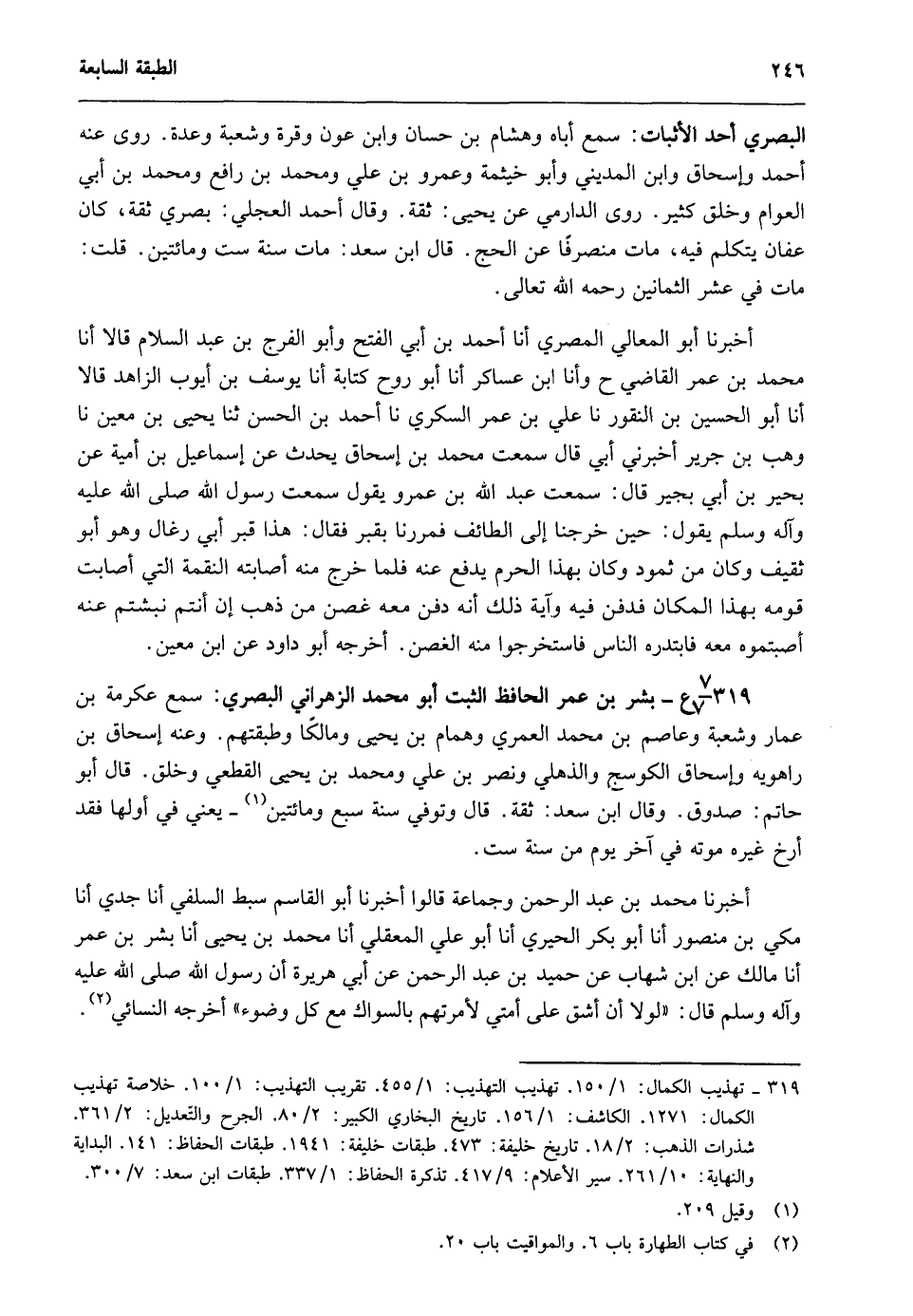 319- 7/ 7ع- بشر بن عمر الحافظ الثبت أبو محمد الزهراني البصري: سمع عكرمة بن عمار وشعبة وعاصم بن محمد العمري وهمام بن يحيى ومالكا وطبقتهم. وعنه إسحاق بن راهويه وإسحاق الكوسج والذهلي ونصر بن علي ومحمد بن يحيى القطعي وخلق. قال أبو حاتم: صدوق. وقال ابن سعد: ثقة. قال وتوفي سنة سبع ومائتين1-يعني في أولها فقد أرخ غيره موته في آخر يوم من سنة ست.