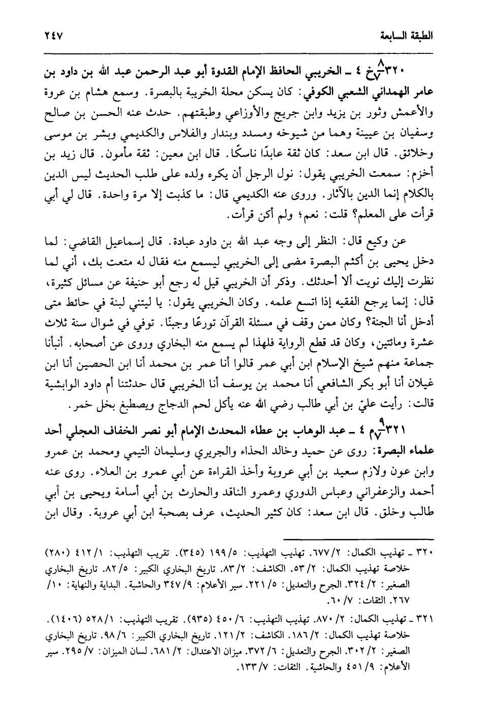 320- 8/ 7 خ 4- الخريبي الحافظ الإمام القدوة أبو عبد الرحمن عبد الله بن داود بن عامر الهمداني الشعبي الكوفي: كان يسكن محلة الخريبة بالبصرة. وسمع هشام بن عروة والأعمش وثور بن يزيد وابن جريج والأوزاعي وطبقتهم. حدث عنه الحسن بن صالح وسفيان بن عيينة وهما من شيوخه ومسدد وبندار والفلاس والكديمي وبشر بن موسى وخلائق. قال ابن سعد: كان ثقة عابدا ناسكا. قال ابن معين: ثقة مأمون. قال زيد بن أخزم: سمعت الخريبي يقول: نول الرجل أن يكره ولده على طلب الحديث ليس الدين بالكلام إنما الدين بالآثار. وروى عنه الكديمي قال: ما كذبت إلا مرة واحدة. قال لي أبي قرأت على المعلم؟ قلت: نعم؛ ولم أكن قرأت.