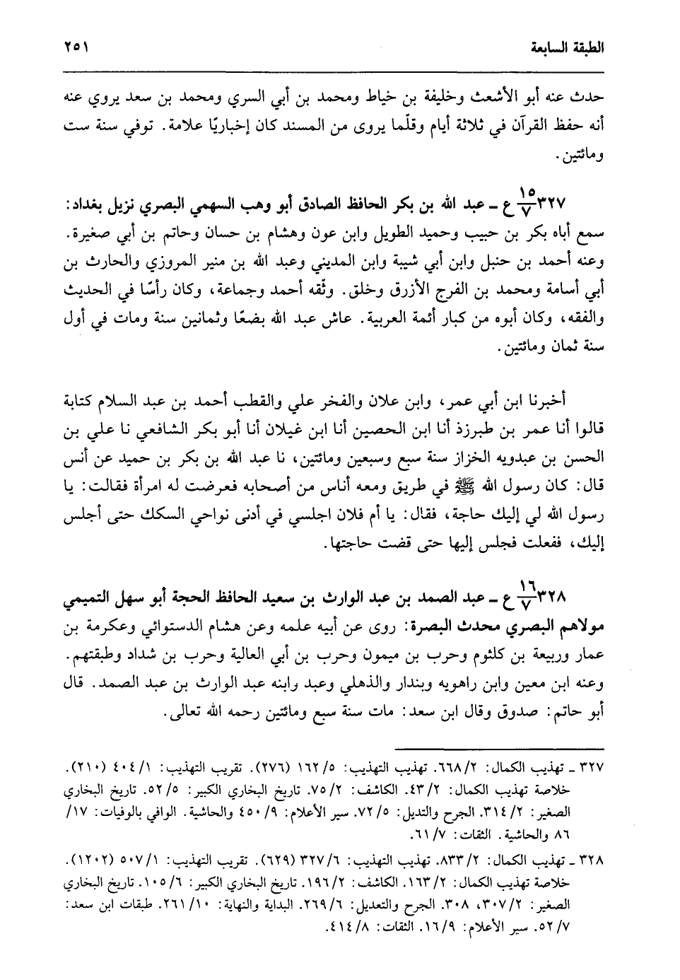 328- 16/ 7 ع- عبد الصمد بن عبد الوارث بن سعيد الحافظ الحجة أبو سهل التميمي مولاهم البصري محدث البصرة: روى عن أبيه علمه وعن هشام الدستوائي وعكرمة بن عمار وربيعة بن كلثوم وحرب بن ميمون وحرب بن أبي العالية وحرب بن شداد وطبقتهم. وعنه ابن معين وابن راهويه وبندار والذهلي وعبد وابنه عبد الوارث بن عبد الصمد. قال أبو حاتم: صدوق وقال ابن سعد: مات سنة سبع ومائتين رحمه الله تعالى.