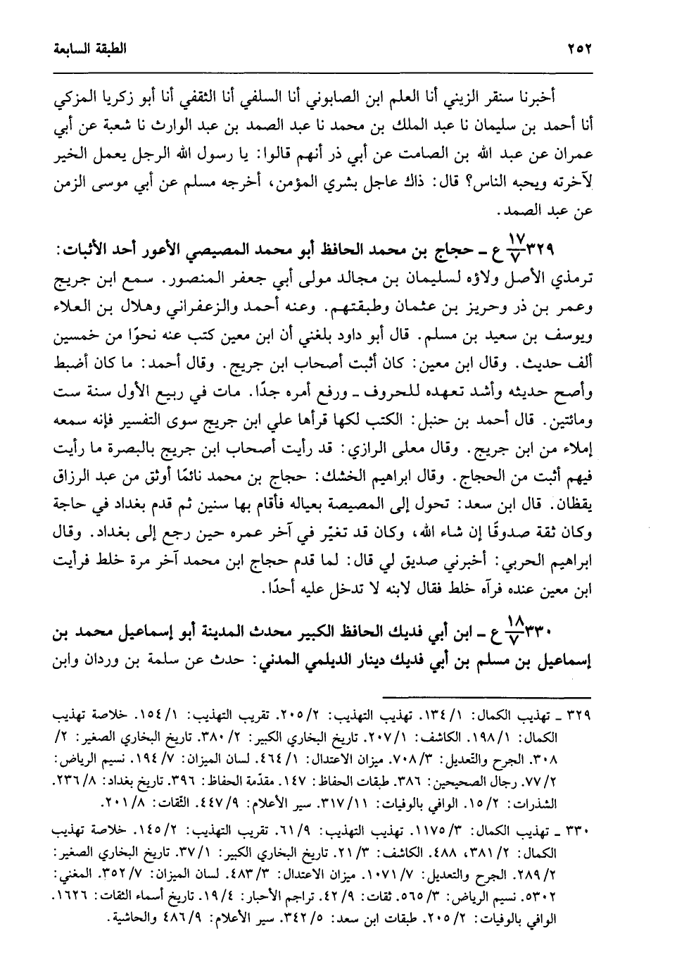 329- 17/ 7 ع- حجاج بن محمد الحافظ أبو محمد المصيصي الأعور أحد الأثبات: ترمذي الأصل ولاؤه لسليمان بن مجالد مولى أبي جعفر المنصور. سمع ابن جريج وعمر بن ذر وحريز بن عثمان وطبقتهم. وعنه أحمد والزعفراني وهلال بن العلاء ويوسف بن سعيد بن مسلم. قال أبو داود بلغني أن ابن معين كتب عنه نحوًا من خمسين ألف حديث. وقال ابن معين: كان أثبت أصحاب ابن جريج. وقال أحمد ما كان أضبط وأصح حديثه وأشد تعهده للحروف -ورفع أمره جدا مات في ربيع الأول سنة ست ومائتين. قال أحمد بن حنبل: الكتب كلها قرأها علي بن جريج سوى التفسير فإنه سمعه إملاء من ابن جريج، وقال معلى الرازي: قد رأيت أصحاب ابن جريج بالبصرة ما رأيت فيهم أثبت من الحجاج. وقال إبراهيم الخشك: حجاج بن محمد نائما أوثق من عبد الرزاق يقظان: قال ابن سعد: تحول إلى المصيصة بعياله فأقام بها سنين ثم قدم بغداد في حاجة وكان ثقة صدوقا إن شاء الله وكان قد تغير في آخر عمره حين رجع إلى بغداد وقال إبراهيم الحربي أخبرني صديق لي قال لما قدم حجاج بن محمد آخر مرة خلط فرأيت بن معين عنده فرآه خلط فقال لابنه لا تدخل عليه أحدا.