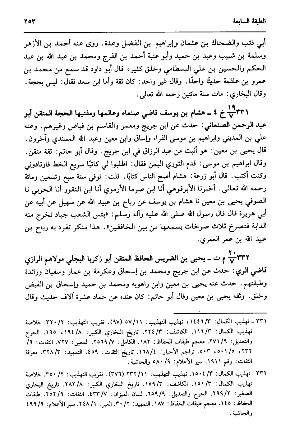 332- 20/ 7م ت - يحيى بن الضريس الحافظ المتقن أبو زكريا البجلي مولاهم الرازي قاضى الري: حدث عن ابن جريج ومحمد بن إسحاق وعكرمة بن عمار وسفيان وزائدة وطبقتهم. حدث عنه يحيى بن معين وابن راهويه ومحمد بن حميد وإسحاق بن الفيض وخلق. وثقه يحيى بن معين وقال أبو حاتم: كان عنده عن حماد عشرة آلاف حديث وقال