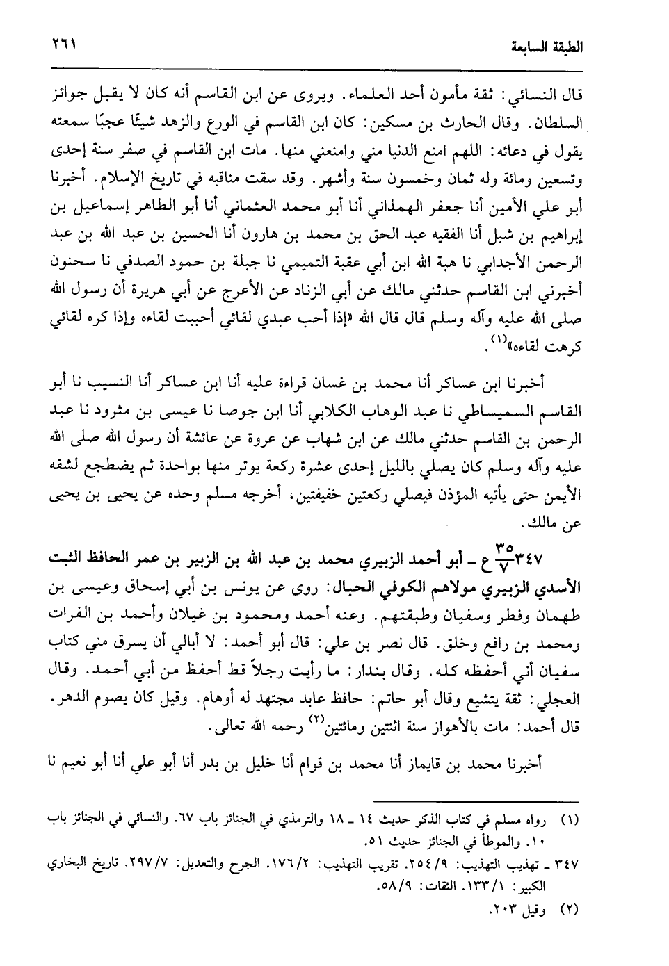 347- 35/ 7 ع- أبو أحمد الزبيري محمد بن عبد الله بن الزبير بن عمر الحافظ الثبت الأسدي الزبيري مولاهم الكوفي الحبال: روى عن يونس بن أبي إسحاق وعيسى بن طهمان وفطر وسفيان وطبقتهم. وعنه أحمد ومحمود بن غيلان وأحمد بن الفرات ومحمد بن رافع وخلق. قال نصر بن علي: قال أبو أحمد: لا أبالي أن يسرق مني كتاب سفيان إني أحفظه كله. وقال بندار: ما رأيت رجلا قط أحفظ من أبي أحمد. وقال العجلي: ثقة يتشيع. وقال أبو حاتم: حافظ عابد مجتهد عابد مجتهد له أوهام. وقيل كان يصوم الدهر. قال أحمد: مات بالأهواز سنة اثنتين ومائتين2 رحمه الله تعالى.