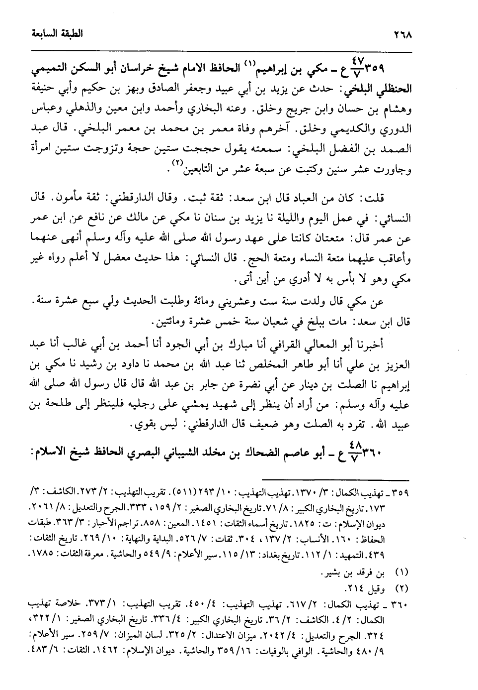 359- 47/ 7 ع - مكي بن إبراهيم 1 الحافظ الإمام شيخ خراسان أبو السكن التميمي الحنظلي البلخي: حدث عن يزيد بن أبي عبيد وجعفر الصادق وبهز بن حكيم وأبي حنيفة وهشام بن حسان وابن جريج وخلق. وعنه البخاري وأحمد وابن معين والذهلي وعباس الدوري والكديمي وخلق. آخرهم وفاة معمر بن محمد بن معمر البلخي. قال عبد الصمد بن الفضل البلخي. سمعته يقول: حججت ستين حجة وتزوجت ستين امرأة وجاورت عشر سنين وكتبت عن سبعة عشر من التابعين2.