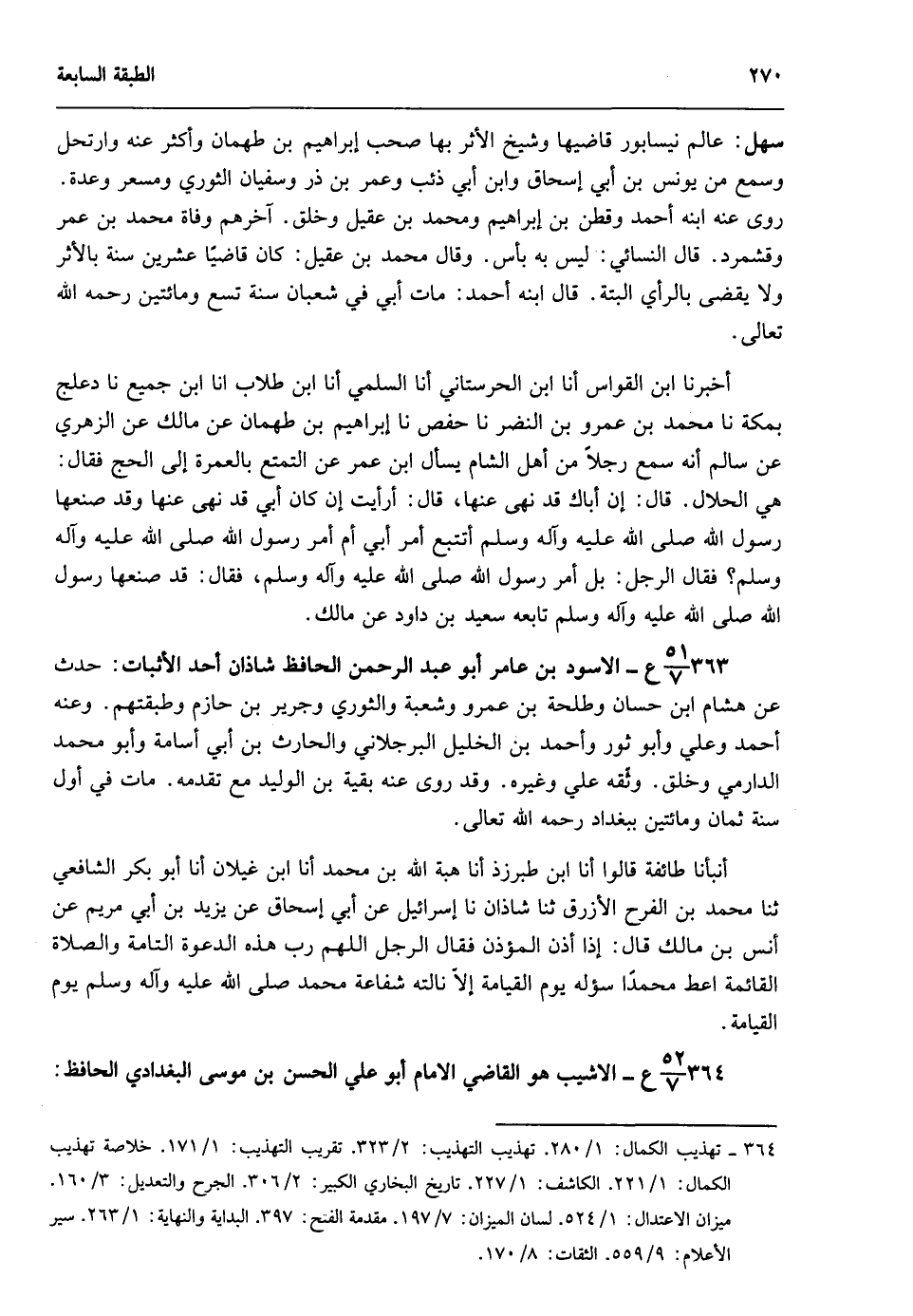 363- 51/ 7ع- الأسود بن عامر أبو عبد الرحمن الحافظ شاذان أحد الأثبات: حدث عن هشام بن حسان وطلحة بن عمرو وشعبة والثوري وجرير بن حازم وطبقتهم. وعنه أحمد وعلي وأبو ثور وأحمد بن الخليل البرجلاني والحارث بن أبي أسامة وأبو محمد الدارمي وخلق. وثقه علي وغيره. وقد روى عنه بقية بن الوليد مع تقدمه. مات في أول سنة ثمان ومائتين ببغداد رحمه الله تعالى.