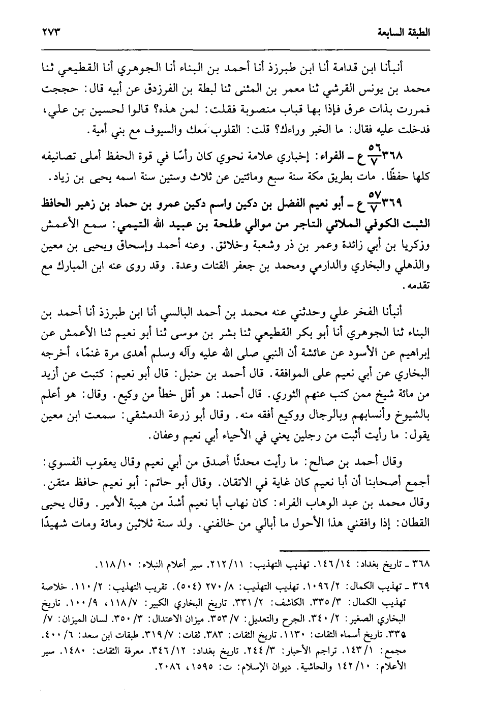 369- 57/ 7ع- أبو نعيم الفضل بن دكين واسم دكين عمرو بن حماد بن زهير الحافظ الثبت الكوفي الملائي التاجر من موالي طلحة بن عبيد الله التيمي: سمع الأعمش وزكريا بن أبي زائدة وعمر بن ذر وشعبة وخلائق. وعنه أحمد وإسحاق ويحيى بن معين والذهلي والبخاري والدارمي ومحمد بن جعفر القتات وعدة. وقد روى عنه ابن المبارك مع تقدمه.