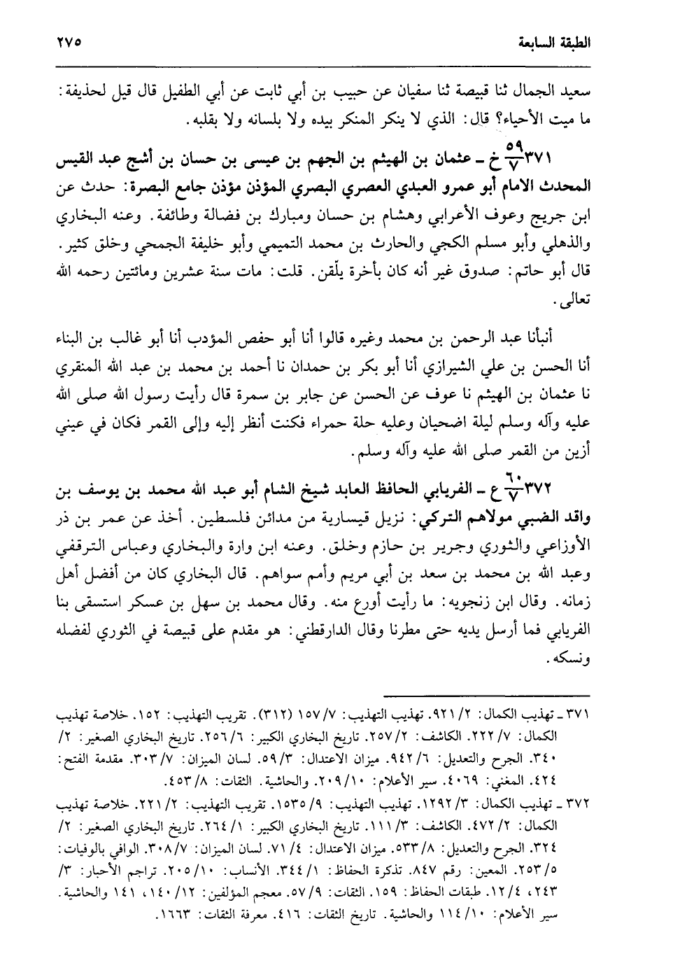 372- 60/ 7ع- الفريابي الحافظ العابد شيخ الشام أبو عبد الله محمد بن يوسف بن واقد الضبي مولاهم التركي: نزيل قيسارية من مدائن فلسطين. أخذ عن عمر بن ذر والأوزاعي والثوري وجرير بن حازم وخلق. وعنه ابن وارة والبخاري وعباس الترقفي وعبد الله بن محمد بن سعد بن أبي مريم وأمم سواهم. قال البخاري كان من أفضل أهل زمانه. وقال ابن زنجويه: ما رأيت أورع منه. وقال محمد بن سهل بن عسكر استسقى بنا الفريابي فما أرسل يديه حتى مطرنا وقال الدارقطني: هو مقدم على قبيصة في الثوري لفضله ونسكه.