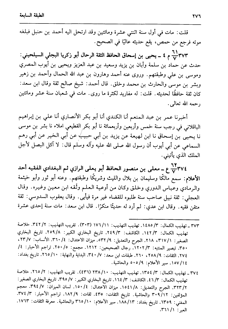 374- 62/ 7ع- معلى بن منصور الحافظ أبو يعلى الرازي ثم البغدادي الفقيه أحد الأعلام: سمع مالكا وسليمان بن بلال والليث وشريكا وطبقتهم وعنه أبو ثور وأبو خيثمة والرمادى وعباس الدوري وخلق وكان من أوعية العلم وثقه ابن معين وغيره وقال العجلي: ثقة نبيل صاحب سنة طلبوه للقضاء غير مرة فيأبى وقال يعقوب السدوسي: ثقة متقن فقيه وقال ابن عدي: لم أرد له حديثا منكرا. قال ابن سعد: مات سنة إحدى عشرة