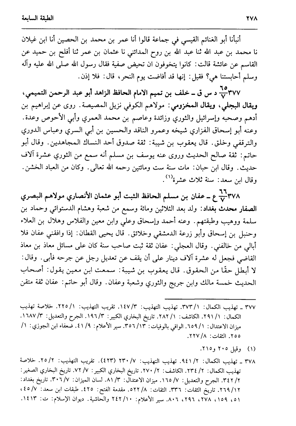 378- 66/ 7 ع- عفان بن مسلم الحافظ الثبت أبو عثمان الأنصاري مولاهم البصري الصفار محدث بغداد: ولد بعد الثلاثين ومائة وسمع من شعبة وهشام الدستوائي وحماد بن سلمة ووهيب وطبقتهم. وعنه أحمد وإسحاق وعلي وابن معين والفلاس وهلال بن العلاء وحنبل بن إسحاق وأبو زرعة الدمشقي وخلائق. قال يحيى القطان: إذا وافقني عفان فلا أبالي من خالفني. وقال العجلي: عفان ثقة ثبت صاحب سنة كان على مسائل معاذ بن معاذ القاضي فجعل له عشرة آلاف دينار على أن يقف عن تعديل رجل وعن جرحه فأبى. وقال: لا أبطل حقا من الحقوق. قال يعقوب بن شيبة: سمعت ابن معين يقول: أصحاب الحديث خمسة مالك وابن جريج والثوري وشعبة وعفان. وقال أبو حاتم: عفان ثقة متقن