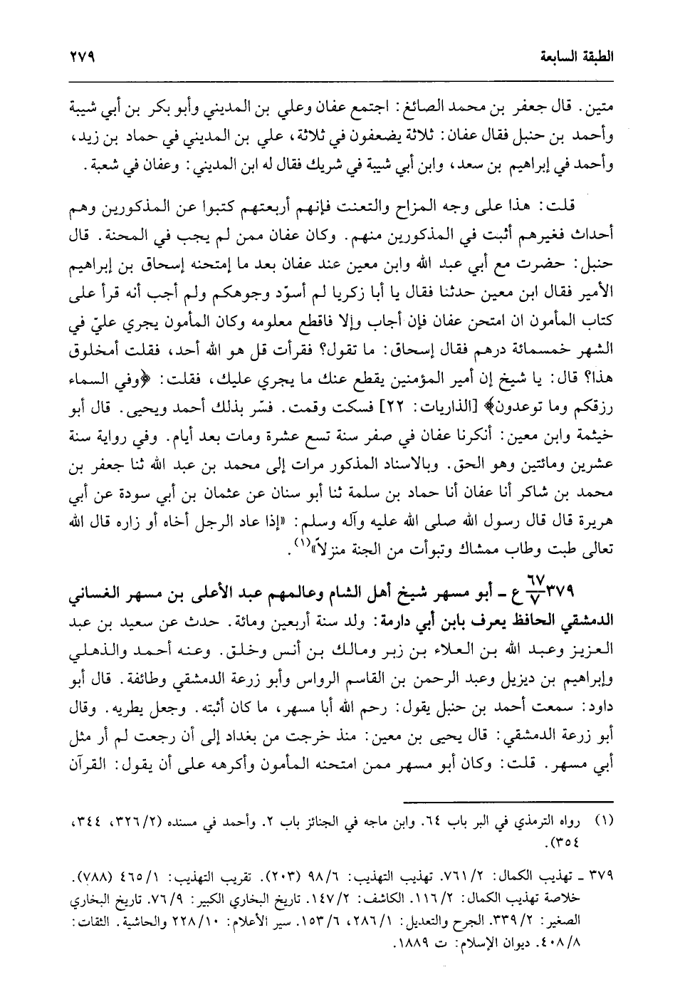 قلت: هذا على وجه المزاح والتعنت فإنهم أربعتهم كتبوا عن المذكورين وهم أحداث فغيرهم أثبت في المذكورين منهم. وكان عفان ممن لم يجب في المحنة. قال حنبل: حضرت مع أبي عبد الله وابن معين عند عفان بعد ما امتحنه إسحاق بن إبراهيم الأمير فقال ابن معين حدثنا فقال يا أبا زكريا لم اسوّد وجوهكم ولم أجب أنه قرأ على كتاب المأمون أن امتحن عفان فإن أجاب وإلا فاقطع معلومه وكان المأمون يجري علي في الشهر خمسمائة درهم فقال إسحاق: ما تقول؟ فقرأت قل هو الله أحد، فقلت أمخلوق هذا؟ قال: يا شيخ إن أمير المؤمنين يقطع عنك ما يجري عليك، فقلت {وَفِي السَّمَاءِ رِزْقُكُمْ وَمَا تُوعَدُون} [الذاريات: 22] فسكت وقمت. فسر بذلك أحمد ويحيى. قال أبو خيثمة وابن معين: أنكرنا عفان في صفر سنة تسع عشرة ومات بعد أيام. وفي رواية سنة عشرين ومائتين وهو الحق. وبالإسناد المذكور مرات إلى محمد بن عبد الله ثنا جعفر بن محمد بن شاكر أنا عفان أنا حماد بن سلمة ثنا أبو سنان عن عثمان بن أبي سودة عن أبي هريرة قال قال رسول الله صلى الله عليه وآله وسلم: "إذا عاد الرجل أخاه أو زاره قال الله تعالى طبت وطاب ممشاك وتبوأت من الجنة منزلا" 1.