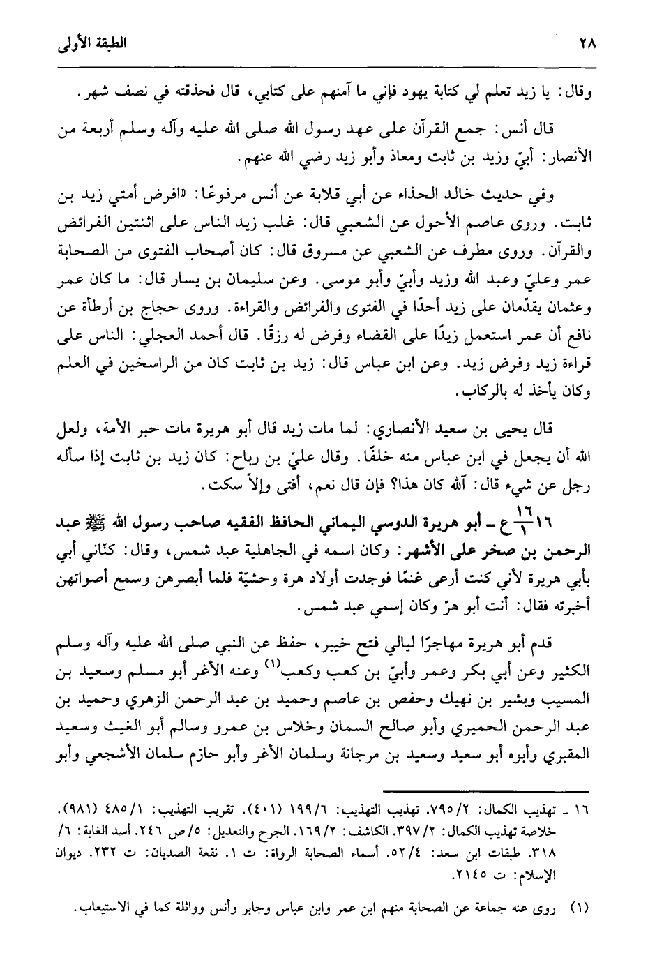 16- 16/ 1ع- أبو هريرة الدوسي اليماني الحافظ الفقيه صاحب رسول الله صلى الله عليه وسلم عبد الرحمن بن صخر على الأشهر: كان اسمه في الجاهلية عبد شمس، وقال: كنانى أبي بأبي هريرة لأنى كنت أرعى غنما فوجدت أولاد هرة وحشية فلما أبصرهن وسمع أصواتهن أخبرته فقال: أنت أبو هر وكان اسمى عبد شمس.