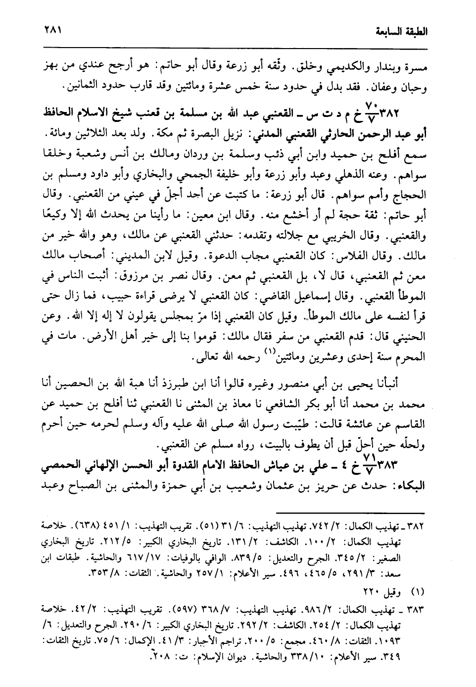 382- 70/ 7خ م د ت س - القعنبي عبد الله بن مسلمة بن قعنب شيخ الإسلام الحافظ أبو عبد الرحمن الحارثي القعنبي المدني: نزيل البصرة ثم مكة. ولد بعد الثلاثين ومائة. سمع أفلح بن حميد وابن أبي ذئب وسلمة بن وردان ومالك بن أنس وشعبة وخلقا سواهم. وعنه الذهلي وعبد وأبو زرعة وأبو خليفة الجمحي والبخاري وأبو مسلم بن الحجاج وأمم سواهم. قال أبو زرعة: ما كتبت عن أحد أجل في عيني من القعنبي. وقال أبو حاتم: ثقة حجة لم أر أخشع منه. وقال ابن معين: ما رأينا من يحدث الله إلا وكيعا والقعنبي. وقال الخريبي مع جلالته وتقدمه. حدثني القعنبي عن مالك، وهو والله خير من مالك. وقال الفلاس: كان القعنبي مجاب الدعوة. وقيل لابن المديني: أصحاب مالك معن ثم القعنبي، قال لا، بل القعنبي ثم معن. وقال نصر بن مرزوق: أثبت الناس في الموطأ القعنبي. وقال إسماعيل القاضي: كان القعنبي إذا مر بمجلس يقولون لا إله إلا الله. وعن الحنيني قال: قدم القعنبي من سفر فقال مالك: قوموا بنا إلى خير أهل الأرض. مات في المحرم سنة إحدى وعشرين ومائتين1 رحمه الله تعالى.