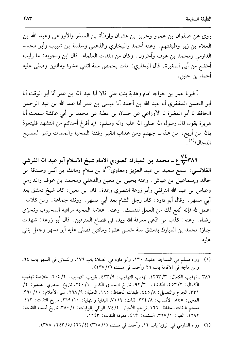 386- 74/ 7 ع- محمد بن المبارك الصوري الإمام شيخ الإسلام أبو عبد الله القرشي القلانسي: سمع سعيد بن عبد العزيز ومعاوية2 بن سلام ومالك بن أنس وصدقة بن خالد وإسماعيل بن عياش. وعنه يحيى بن معين والذهلي ومحمد بن عوف والدارمي وعباس بن عبد الله الترقفي وأبو زرعة النصري وعدة. قال ابن معين: كان شيخ دمشق بعد أبي مسهر. وقال أبو داود: كان رجل الشام بعد أبي مسهر. ووثقه جماعة. ومن كلامه: اعمل لله فإنه أنفع لك من العمل لنفسك. وعنه: علامة المحبة مراقبة المحبوب وتحري رضاه. وعنه: كذب من ادعى معرفة الله ويده في قصاع المترفين. قال أبو زرعة: شهدت جنازة محمد بن المبارك بدمشق سنة خمس عشرة ومائتين فصلى عليه أبو مسهر وجعل يثني عليه.