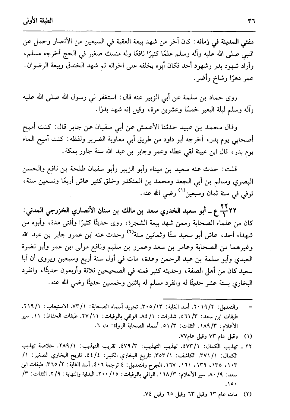 22- 22/ 1ع- أبو سعيد الخدري سعد بن مالك بن سنان الأنصاري الخزرجي المدني: كان من علماء الصحابة وممن شهد بيعة الشجرة، روى حديثا كثيرًا وأفتى مدة وأبوه من شهداء أحد، عاش أبو سعيد ستا وثمانين سنة2 وحدث عنه بن عمرو جابر بن عبد الله وغيرهما من الصحابة وعامر بن سعد وعمرو بن سليم ونافع مولى بن عمر وأبو نضرة العبدي وأبو سلمة بن عبد الرحمن وعدة مات في أول سنة أربع وسبعين ويروى ان أبا سعيد كان من أهل الصفة وحديثه كثير فمنه في الصحيحين ثلاثة وأربعون حديثا، وانفرد البخاري بستة عشر حديثا له وانفرد مسلم له باثنين وخمسين حديثا رضي الله عنه.