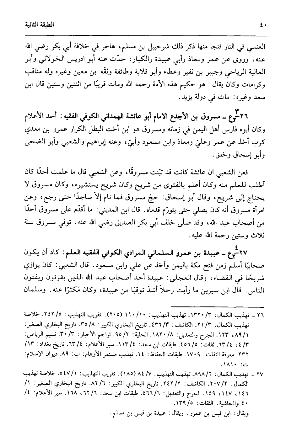 26- 3/ 2ع- مسروق بن الأجدع الإمام أبو عائشة الهمداني الكوفى الفقيه: أحد الأعلام وكان أبوه فارس أهل اليمن في زمانه ومسروق هو بن أخت البطل الكرار عمرو بن معدى كرب أخذ عن عمر وعلي ومعاذ وابن مسعود وأبي وعنه إبراهيم والشعبي أبو الضحى وأبو إسحاق وخلق.