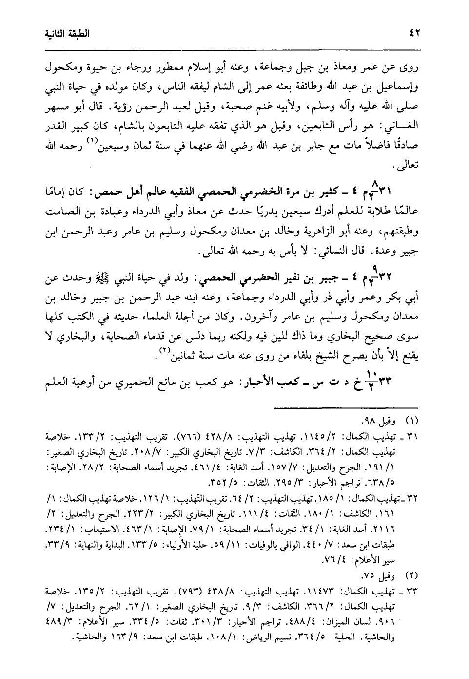 32- 9/ 2م ع- جبير بن نفير الحضرمي الحمصي: ولد في حياة النبي صلى الله عليه وسلم وحدث عن أبي بكر وعمر وأبي ذر وأبي الدرداء وجماعة وعنه ابنه عبد الرحمن بن جبير وخالد بن معدان ومكحول وسليم بن عامر وآخرون. وكان من أجلة العلماء حدث في الكتب كلها سوى صحيح البخاري وما ذاك للين فيه ولكنه ربما دلس عن قدماء الصحابة والبخاري لا يقنع الا بأن يصرح الشيخ بلقاء من روى عنه مات سنة ثمانين2.