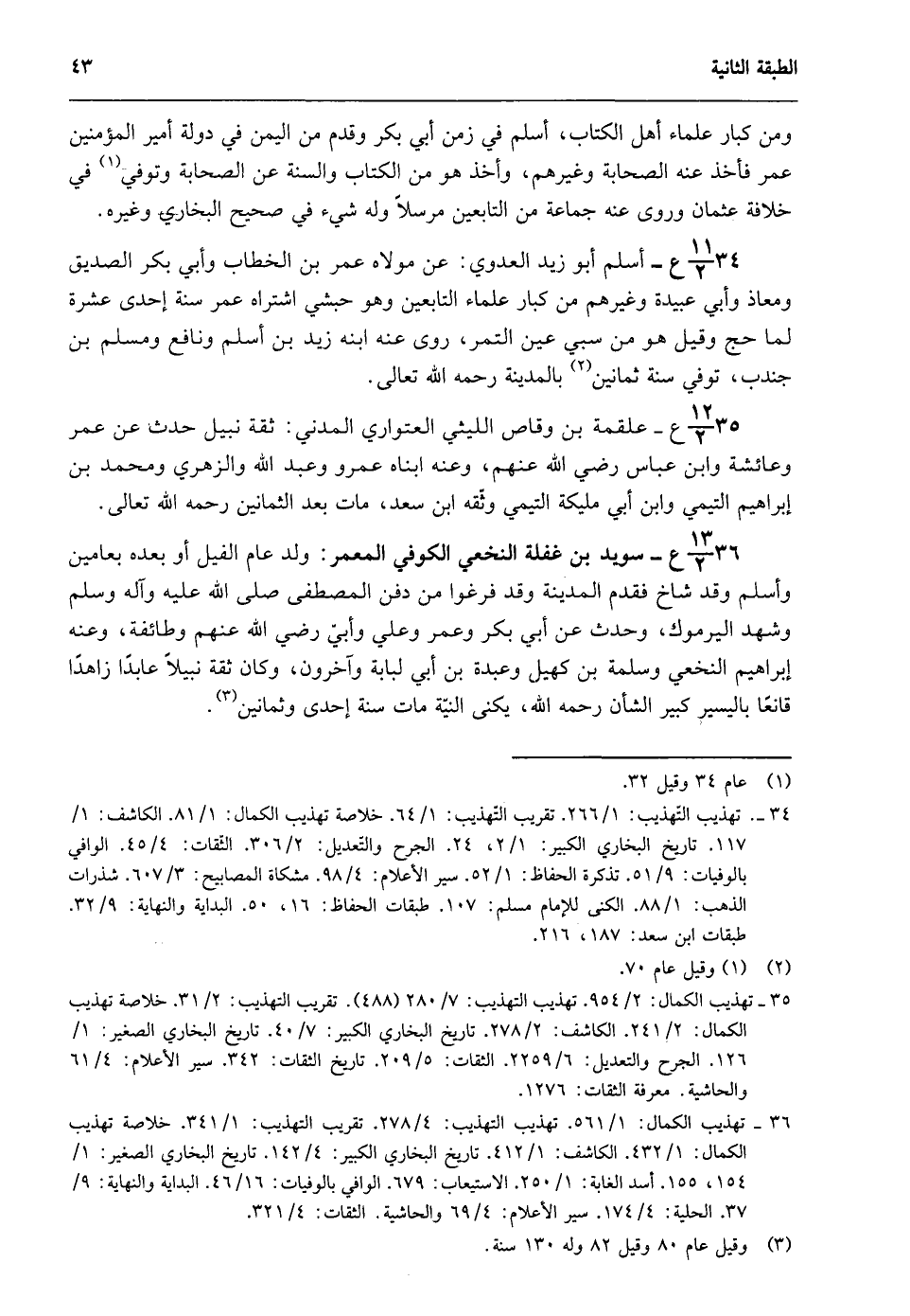 34- 11/ 2ع- أسلم أبو زيد العدوى: عن مولاه عمر بن الخطاب وأبي بكر الصديق ومعاذ وأبي عبيدة وغيرهم من كبار علماء التابعين وهو حبشي اشتراه عمر سنة إحدى عشرة لما حج وقيل هو من سبي عين التمر، روى عنه ابنه زيد بن أسلم ونافع وسلم بن جندب، توفي سنة ثمانين2 بالمدينة رحمه الله تعالى.