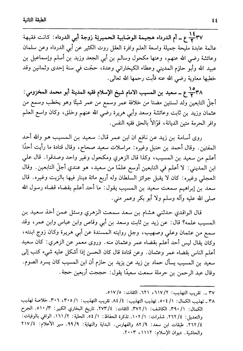 38- 15/ 2ع- سعيد بن المسيب الإمام شيخ الإسلام فقيه المدينة أبو محمد المخزومي: أجل التابعين ولد لسنتين مضتا من خلافة عمر وسمع من عمر شيئا وهو يخطب وسمع من عثمان وزيد بن ثابت وعائشة وسعد وأبي هريرة رضي الله عنهم وخلق، وكان واسع العلم وافر الحرمة متين الديانة، قوالا بالحق فقيه النفس.