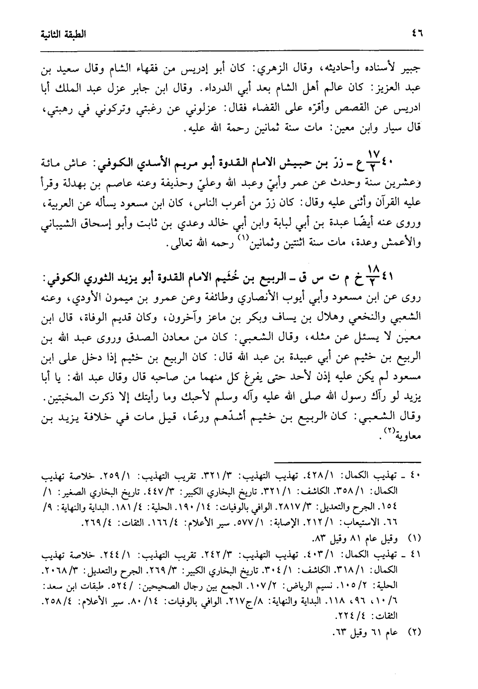 40- 27/ 2ع- زر بن حبيش الإمام القدوة أبو مريم الأسدي الكوفي: عاش مائة وعشرين سنة وحدث عن عمر وأبي وعبد الله وعلي وحذيفة وعنه عاصم بن بهدلة وقرأ عليه القرآن وأثنى عليه وقال: كان زر من أعرب الناس، كان ابن مسعود يسأله عن العربية، وروى عنه أيضا عبدة بن أبي لبابة وابن أبي خالد وعدي بن ثابت وأبو إسحاق الشيباني والأعمش وعدة، مات سنة اثنتين وثمانين1 رحمه الله تعالى.