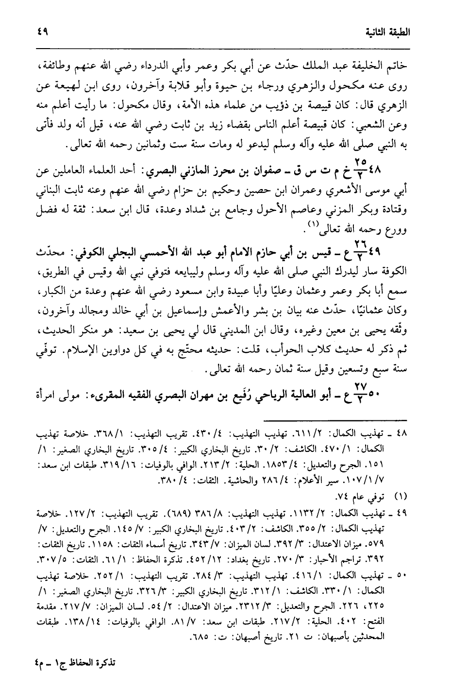 49- 26/ 2ع- قيس بن أبي حازم الإمام أبو عبد الله الأحمسي البجلي الكوفي: محدث الكوفة سار ليدرك النبي صلى الله عليه وآله وسلم وليبايعه فتوفي نبي الله وقيس في الطريق، سمع أبا بكر وعمر وعثمان وعليا وأبا عبيدة وابن مسعود رضي الله عنهم وعدة من الكبار وكان عثمانيا حدث عنه بيان بن بشر والأعمش وإسماعيل بن أبي خالد ومجالد وآخرون وثقه يحيى بن معين وغيره وقال ابن المديني قال لي يحيى بن سعيد هو منكر الحديث ثم ذكر له حديث كلاب الحوأب قلت حديثه محتج به في كل دواوين الإسلام. توفي سنة سبع وتسعين وقيل سنة ثمان رحمه الله تعالى.
