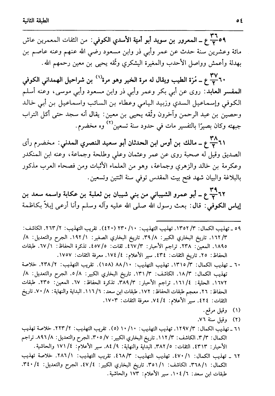 59- 36/ 2ع - المعرور بن سويد أبو أمية الأسدي الكوفى: من الثقات المعمرين عاش مائة وعشرين سنة حدث عن عمر وأبي ذر وابن مسعود رضي الله عنهم وعنه عاصم بن بهدلة وأعمش وواصل الأحدب والمغيرة اليشكري وثقه يحيى بن معين رحمهم الله.