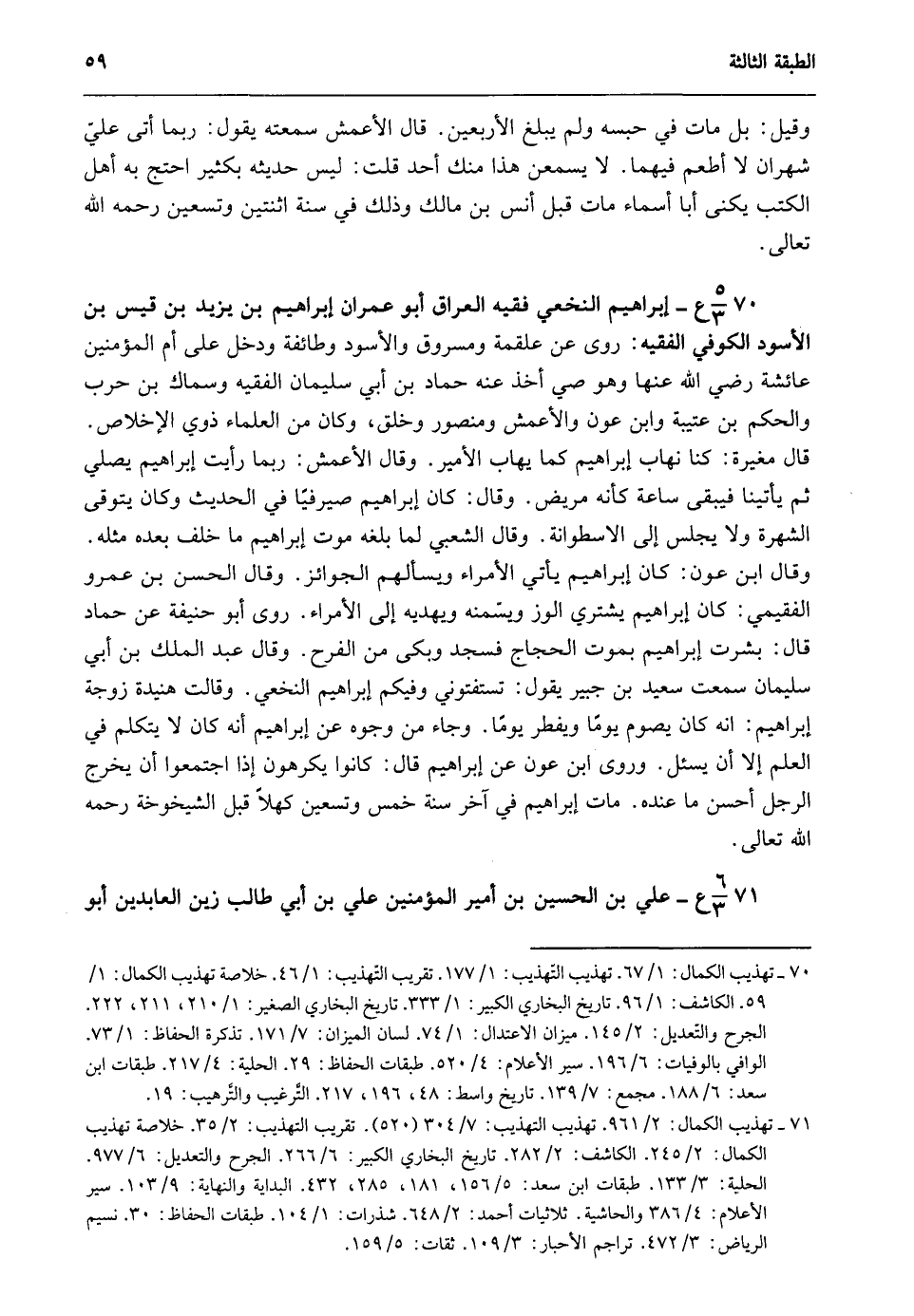 70- 5/ 3ع- إبراهيم النخعي فقيه العراق أبو عمران إبراهيم بن يزيد بن قيس بن الأسود الكوفي الفقيه: روى عن علقمة ومسروق والأسود وطائفة ودخل علي أم المؤمنين عائشة رضي الله عنها وهو صبي أخذ عنه حماد بن أبي سليمان الفقيه وسماك بن حرب والحكم بن عتيبة وابن عون والأعمش ومنصور وخلق وكان من العلماء ذوي الإخلاص قال مغيرة كنا نهاب إبراهيم كما يهاب الأمير وقال الأعمش ربما رأيت إبراهيم يصلي ثم يأتينا فيبقى ساعة كأنه مريض وقال كان إبراهيم صيرفيا في الحديث وكان يتوقى الشهرة ولا يجلس الى الإسطوانة وقال الشعبي لما بلغه موت إبراهيم ما خلف بعده مثله وقال بن عون كان إبراهيم يأتي الأمراء ويسألهم الجوائز وقال الحسن بن عمرو الفقيمي كان إبراهيم يشتري الوز ويسمنه ويهديه إلى الأمراء روى أبو حنيفة عن حماد قال بشرت إبراهيم بموت الحجاج فسجد وبكى من الفرح وقال عبد الله بن أبي سليمان سمعت سعيد بن جبير يقول تستفتوني وفيكم إبراهيم النخعي وقالت هنيدة زوجة إبراهيم أنه كان يصوم يوما ويفطر يوما وجاء من وجوه عن إبراهيم أنه كان لا يتكلم في العلم ألا أن يسئل وروى بن عون عن إبراهيم قال: كانوا يكرهون إذا اجتمعوا أن يخرج الرجل أحسن ما عنده مات إبراهيم في آخر سنة خمس وتسعين كهلا قبل الشيخوخة رحمه الله تعالى.