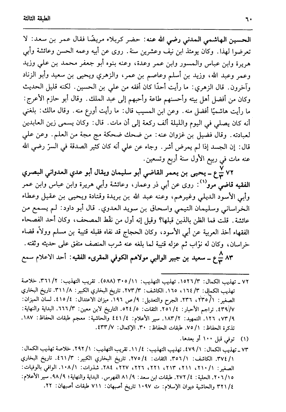 72- 7/ 3ع- يحيى بن يعمر القاضي أبو سليمان ويقال أبو عدي العدواني البصري الفقيه قاضي مرو 1: روى عن أبي ذر وعمار وعائشة وأبي هريرة وابن عباس وابن عمر وأبي الأسود الديلي وغيرهم وعنه عبد الله بن بريدة وقتادة ويحيى بن عقيل وعطاء الخراساني وسليمان التيمي وإسحاق بن سويد العدوي قال أبو داود لم يسمع من عائشة قلت فما الظن بالذين قبلها وقيل أنه أول من نقط المصحف وكان أحد الفصحاء الفقهاء أخذ العربية عن أبي الأسود وكان الحجاج قد نفاه فقبله قتيبة بن مسلم وولاه قضاء خراسان، وكان له عدة نواب ثم عزله قتيبة لما بلغه عنه شرب المنصف متفق على حديثه وثقته.