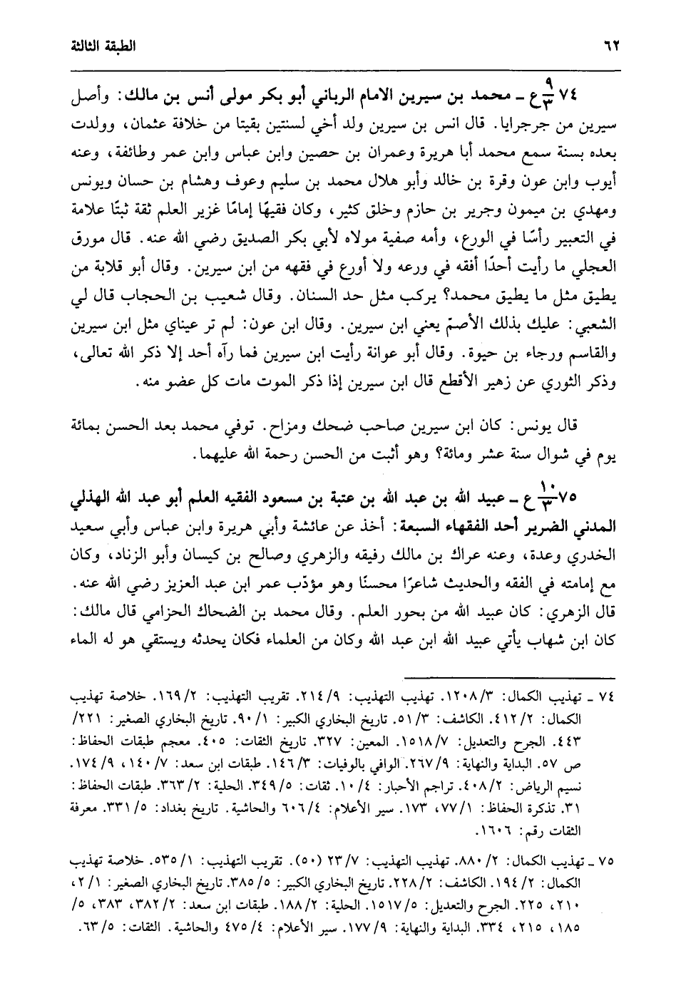 75- 10/ 3ع- عبيد الله بن عبد الله بن عتبة بن مسعود الفقيه العلم أبو عبد الله الهذلى المدني الضرير أحد الفقهاء السبعة: أخذ عن عائشة وأبي هريرة وابن عباس وأبي سعيد الخدري وعدة وعنه عراك بن مالك رفيقه والزهري وصالح بن كيسان وأبو الزناد وكان مع إمامته في الفقه والحديث شاعرا محسنا وهو مؤدب عمر بن عبد العزيز رضي الله عنه قال الزهرى كان عبيد الله من بحور العلم وقال محمد بن الضحاك الحزامى قال مالك كان بن شهاب يأتى عبيد الله بن عبد الله وكان من العلماء فكان يحدثه ويستقى هو له الماء