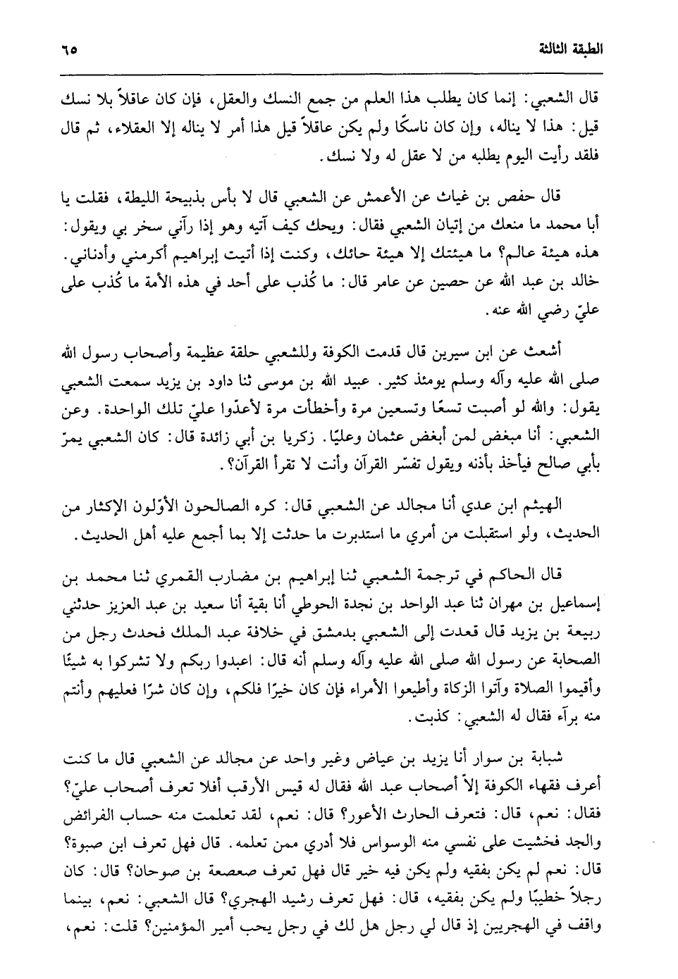 أشعث عن ابن سيرين قال قدمت الكوفة وللشعبى حلقة عظيمة وأصحاب رسول الله صلى الله عليه وآله وسلم يومئذ كثير. عبيد الله بن موسى ثنا داود بن يزيد سمعت الشعبي يقول والله لو أصبت تسعا وتسعين مرة واخطأت مرة لأعدلوا على تلك الواحدة وعن الشعبي انا مبغض