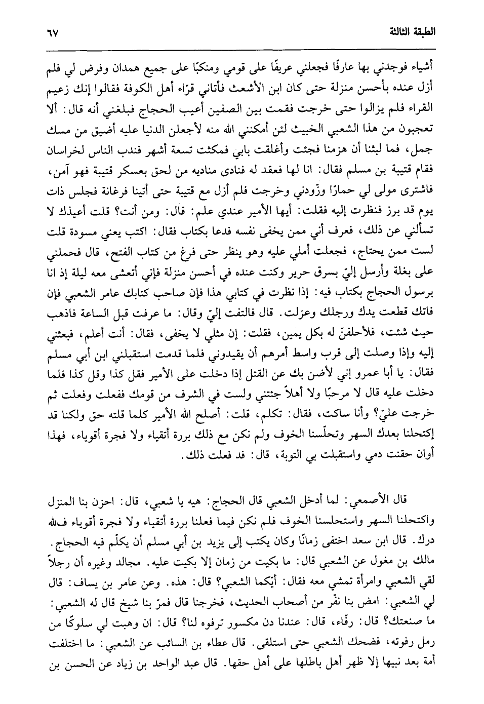 أشياء فوجدني بها عارفا فجعلني عريفا على قومي ومنكبا على جميع همدان وفرض لي فلم أزل عنده بأحسن منزلة حتى كان بن الأشعث فأتاني قراء أهل الكوفة فقالوا انك زعيم القراء فلم يزالوا حتى خرجت فقمت بين الصفين اعيب الحجاج فبلغنى أنه قال: ألا تعجبون من هذا الشعبي الخبيث لئن امكننى الله منه لأجعلن الدنيا عليه اضيق من مسك جمل فما لبثنا ان هزمنا فجئت واغلقت بابي فمكثت تسعة أشهر فندب الناس لخراسان فقام قتيبة بن مسلم فقال: أنا لها فعقد له فنادى مناديه من لحق بعسكر قتيبة فهو آمن فاشترى مولى لي حمارا وزودنى وخرجت فلم أزل مع قتيبة حتى أتينا فرغانة فجلس ذات يوم قد برز فنظرت اليه فقلت أيها الأمير عندي علم قال ومن أنت قلت اعيذك لا تسألني عن ذلك فعرف أني ممن يغفى نفسه فدعى بكتاب فقال: أكتب يعني مسودة قلت لست ممن يحتاج فجعلت أملى عليه وهو ينظر حتى فرغ من كتاب الفتح قال فحملنى على بغلة وأرسل الى بسرق حرير وكنت عنده في أحسن منزلة فانى أتعشى معه ليلة إذ انا برسول الحجاج بكتاب فيه إذا نظرت في كتابي هذا فان صاحب كتابك عامر الشعبي فان فاتك قطعت يدك ورجلك وعزلت قال فالتفت إلي وقال: ما عرفت قبل الساعة فاذهب حيث شئت فلأحلفن له بكل يمين فقلت: إن مثلي لا يخفى فقال: أنت أعلم فبعثنى إليه وإذا وصلت إلى قرب واسط أمرهم أني يقيدونى فلما قدمت استقبلنى بن أبي مسلم فقال: يا أبا عمرو إني لأضن بك عن القتل إذا دخلت على الأمير فقل كذا وقل كذا فلما دخلت عليه قال لا مرحبا ولا أهلا جئتنى ولست في الشرف من قومك ففعلت وفعلت ثم خرجت على وانا ساكت فقال تكلم قلت أصلح الله الأمير كل ما قلته حق ولكنا قد اكتحلنا بعدك السهر وتحلسنا الخوف ولم نكن مع ذلك. بررة اتقياء ولا فجرة أقوياء فهذا أوان حقنت دمى واستقبلت بي التوبة قال: قد فعلت ذلك.