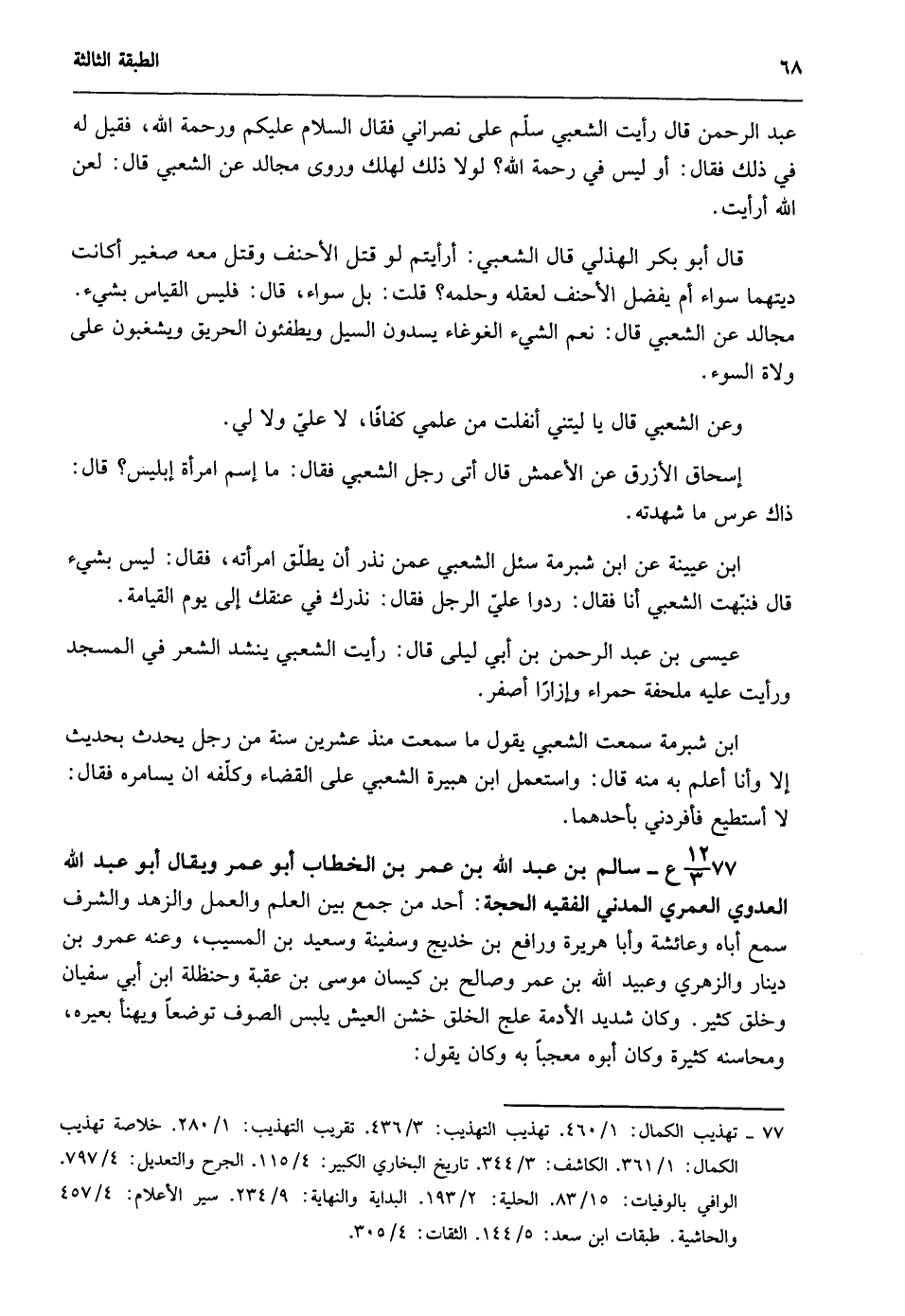 77- 12/ 3ع- سالم بن عبد الله بن عمر بن الخطاب أبو عمر ويقال أبو عبد الله العدوى العمرى المدني الفقيه الحجة: أحد من جمع بين العلم والعمل والزهد والشرف سمع أباه وعائشة وأبا هريرة ورافع بن خديج وسفينة وسعيد بن المسيب وعنه عمرو بن دينار والزهري وعبيد الله بن عمر وصالح بن كيسان وموسى بن عقبة وحنظلة بن أبي سفيان وخلق كثير. وكان شديد الأدمة علج الخلق خشن العيش يلبس الصوف تواضعا ويهنأ بعيره، ومحاسنه كثيرة وكان أبوه معجبا به وكان يقول: