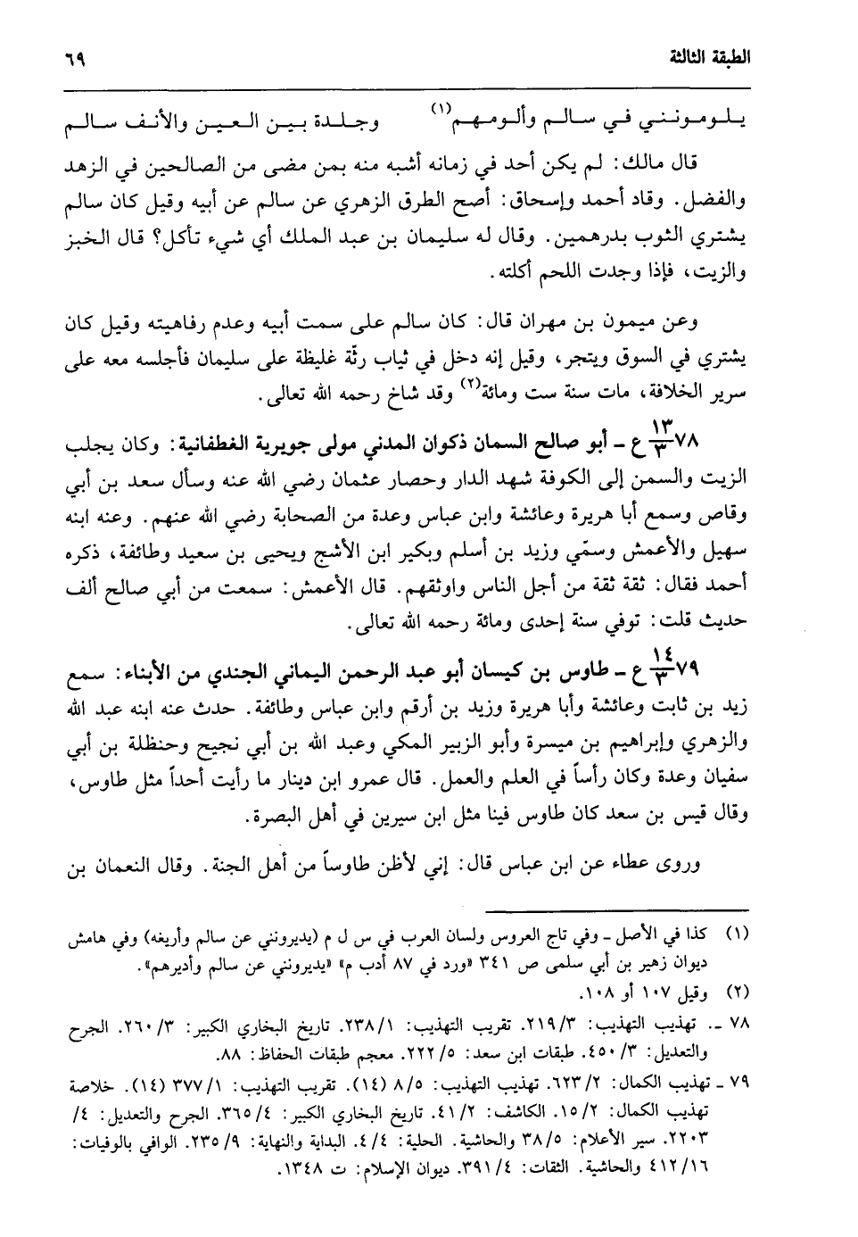 78- 13/ 3ع- أبو صالح السمان ذكوان المدني مولى جويرية الغطفانية: وكان يجلب الزيت والسمن الى الكوفة شهد الدار وحصار عثمان رضي الله عنه وسأل سعد بن أبي وقاص وسمع أبا هريرة وعائشة وابن عباس وعدة من الصحابة رضي الله عنهم. وعنه ابنه سهيل والأعمش وسمى وزيد بن اسلم وبكير بن الأشج ويحيى بن سعيد وطائفة ذكره أحمد فقال ثقة ثقة من أجل الناس واوثقهم قال الأعمش: سمعت من أبي صالح ألف حديث قلت: توفى سنة إحدى ومائة رحمه الله تعالى.