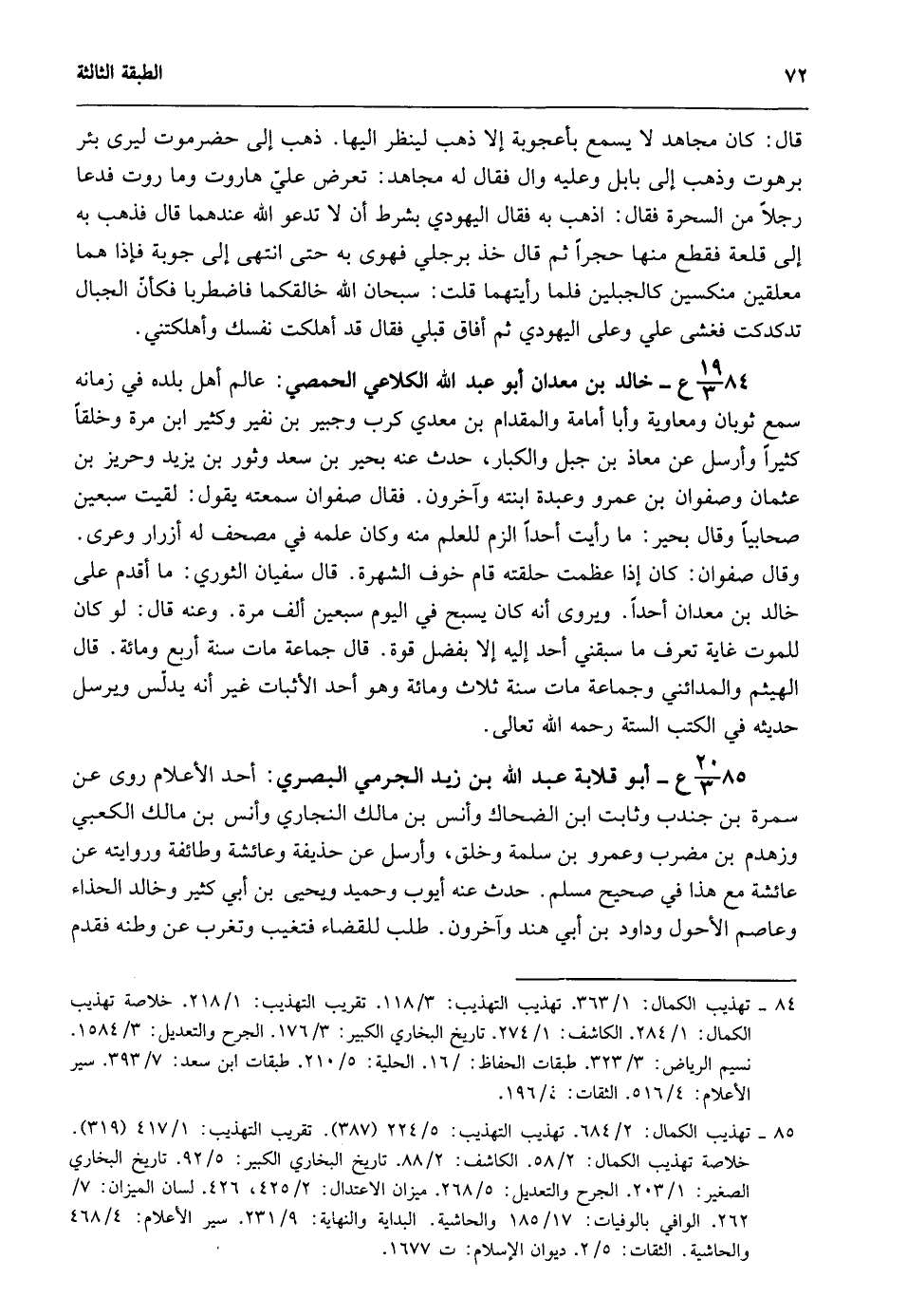 84- 19/ 3ع - خالد بن معدان أبو عبد الله الكلاعي الحمصي: عالم أهل بلده في زمانه سمع ثوبان ومعاوية وأبا امامة والمقدام بن معدى كرب وجبير بن نفير وكثير بن مرة وخلقا كثيرا وأرسل عن معاذ بن جبل والكبار حدث عنه بحير بن سعد وثور بن يزيد وحريز بن عثمان وصفوان بن عمرو وعبدة ابنته وآخرون فقال صفوان سمعته يقول لقيت سبعين صحابيا وقال بحير ما رأيت أحدا الزم للعلم منه وكان علمه في مصحف له ازرار وعرى وقال صفوان كان إذا عظمت حلقته قام خوف الشهرة قال سفيان الثوري ما اقدم على خالد بن معدان أحدا ويروى انه كان يسبح في اليوم سبعين ألف مرة وعنه قال لو كان للموت غاية تعرف ما سبقنى أحد اليه الا بفضل قوة قال جماعة مات سنة أربع ومائة قال الهيثم والمدائنى وجماعة سنة ثلاث ومائة، وهو أحد الأثبات غير أنه يدلس ويرسل حديثه في الكتب الستة رحمه الله تعالى.