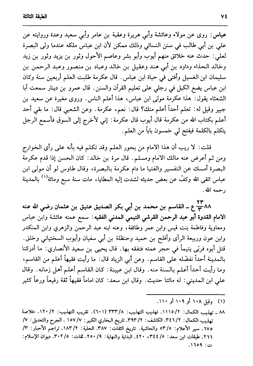 88- 23/ 3ع- القاسم بن محمد بن أبي بكر الصديق عتيق بن عثمان رضي الله عنه الإمام القدوة أبو عبد الرحمن القرشي التيمى المدني الفقيه: سمع عمته عائشة وابن عباس ومعاوية وفاطمة بنت قيس وابن عمر وطائفة، وعنه ابنه عبد الرحمن الزهرى وابن المنكدر وابن عون وربيعة الرأي وأفلح بن حميد وحنظلة بن أبي سفيان وأيوب السختياني وخلق. قتل أبوه فربى يتيما في حجر عمته فتفقه بها. قال يحيى بن سعيد الأنصاري: ما أدركنا بالمدينة أحدا نفضله على القاسم. وعن أبي الزياد قال: ما رأيت فقيها أعلم من القاسم, وما رأيت أحدا أعلم بالسنة منه وقال بن عيينة: كان القاسم اعلم أهل زمانه. وقال على بن المديني: له مائتا حديث. وقال بن سعد: كان إماما فقيها ثقة رفيعا ورعا كثير
